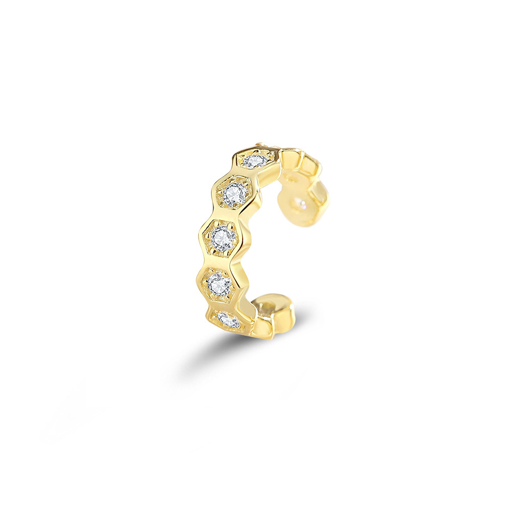 This honeycomb-shaped ear cuff showcases cubic zirconia in a unique geometric design, plated in gold or silver over genuine 925 sterling silver. A versatile non-piercing style that fits the growing demand for trendy and comfortable ear jewelry. Perfect for jewelry retailers, fashion boutiques, and online stores seeking fresh, eye-catching wholesale options.