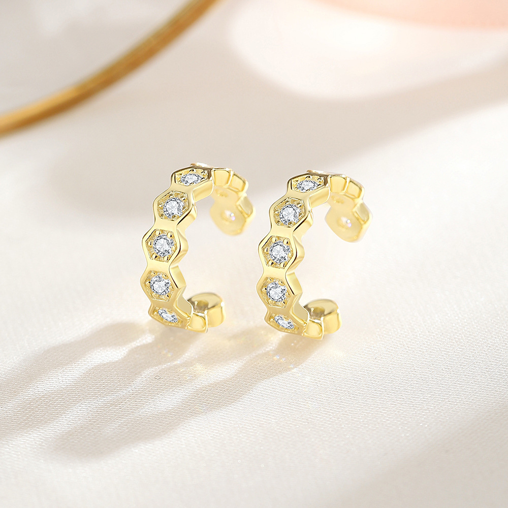 Add a modern geometric touch with this honeycomb-inspired C-shaped ear cuff. Crafted from high-quality 925 sterling silver and available in gold and silver tones, it features sparkling cubic zirconia accents for a refined, stylish look. Designed for comfort, this non-piercing cuff is perfect for layering with other earrings or wearing alone as a chic statement.