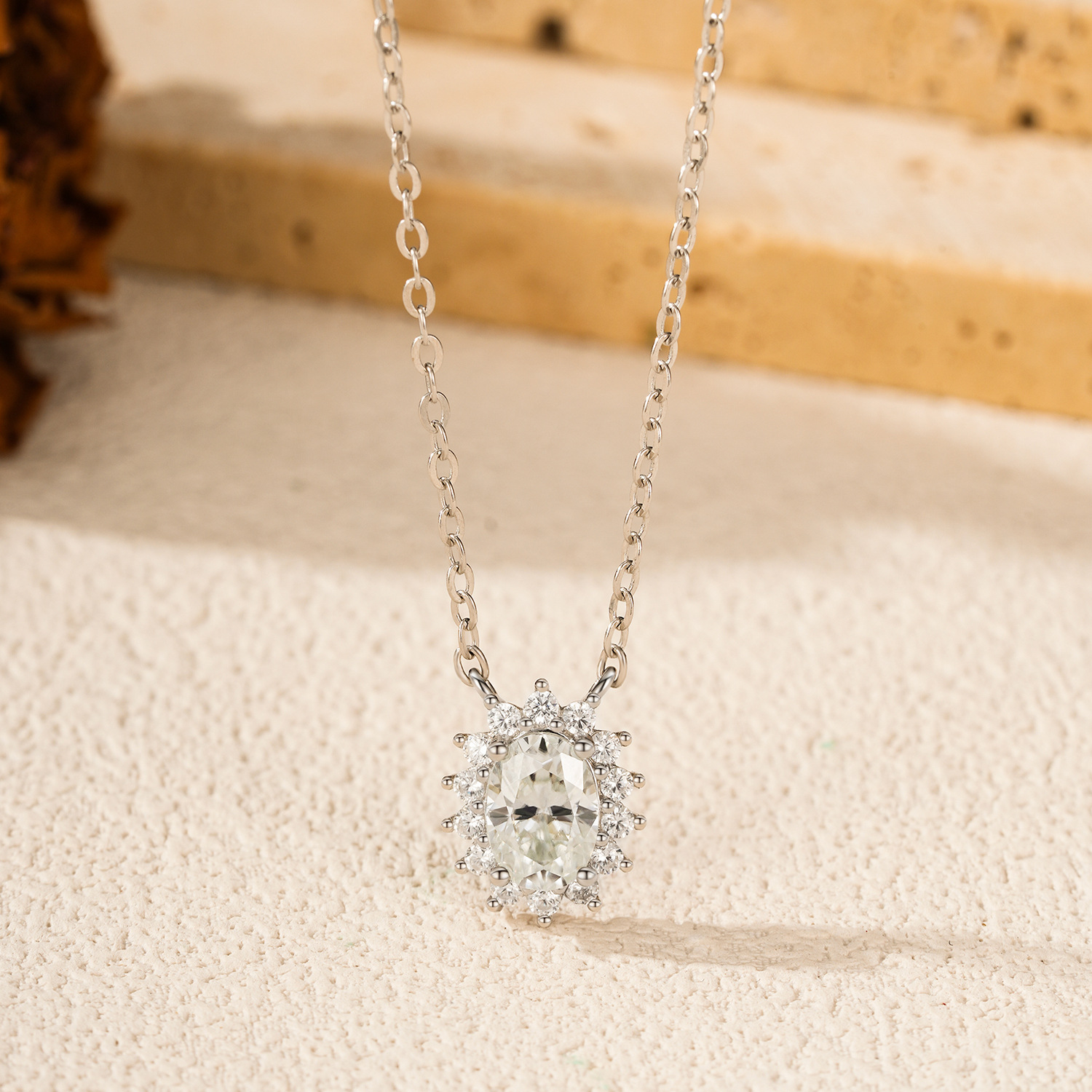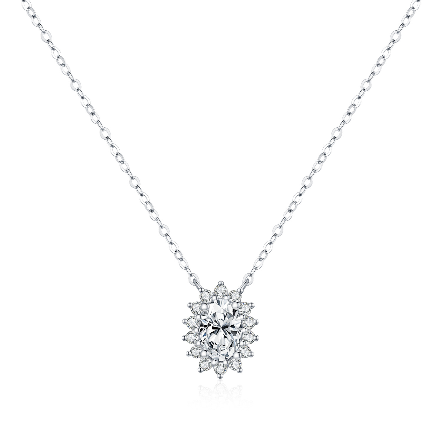 Radiate elegance with our 1 Carat Oval Cut Moissanite Halo Necklace. This exquisite piece features a high-clarity, 1-carat oval Moissanite center stone, encircled by a "Halo" of smaller round stones that amplify its brilliance and size. The pendant is suspended from a delicate S925 sterling silver cable chain that sits perfectly at the collarbone, adding a touch of sophisticated glamour to any neckline. It is a timeless choice for anniversaries, birthdays, or bridal wear.