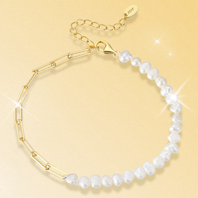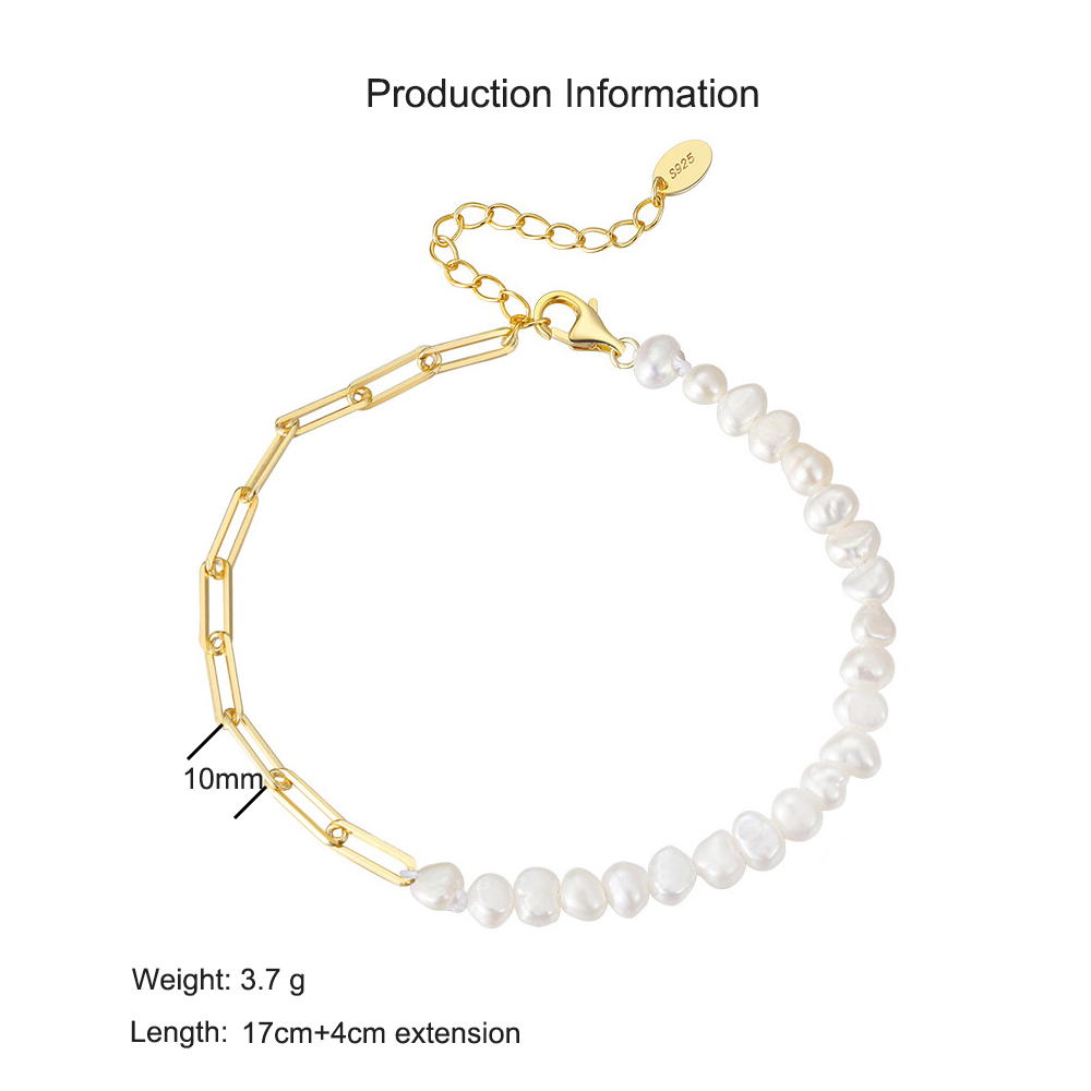 Source a high-demand, trendy item with our 925 Sterling Silver Baroque Pearl & Paperclip Bracelet. This piece features a best-selling hybrid design, combining a strand of genuine natural baroque pearls with a fashionable paperclip chain. Made from authentic 925 sterling silver, this bracelet is available in both a classic silver finish and a durable gold-plated finish. The adjustable extension chain ensures a versatile fit, making it a reliable and profitable item for boutiques and online stores. This is a must-have piece for customers seeking high-quality, contemporary silver jewelry. Available for bulk purchase at competitive wholesale prices.