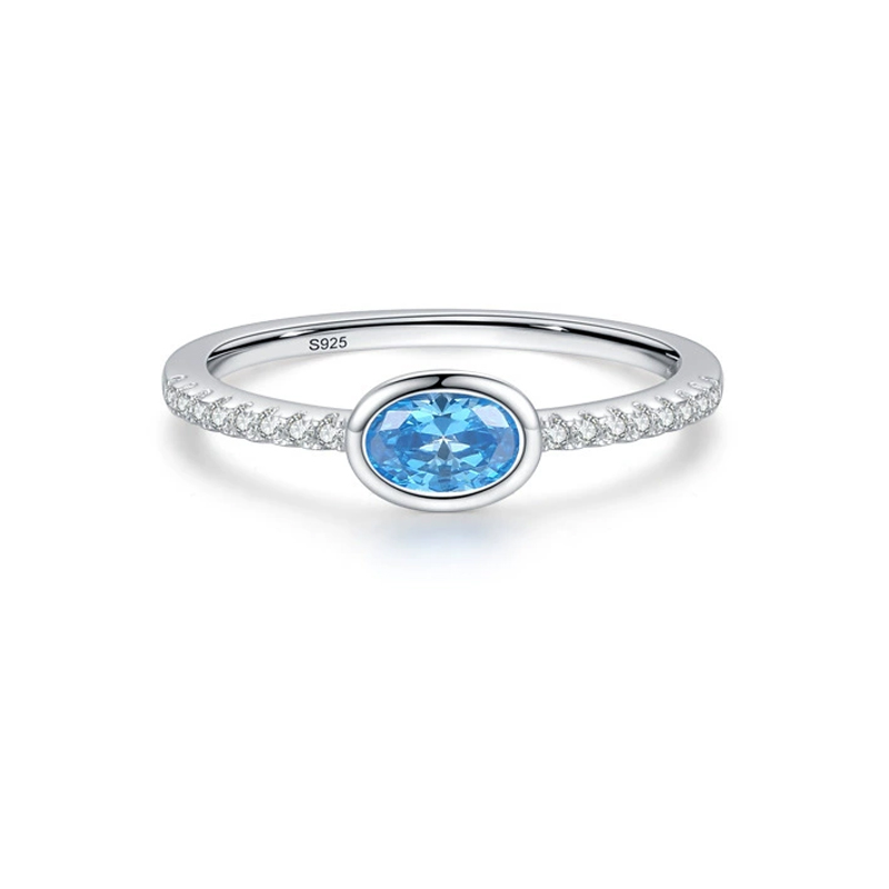 These wholesale 925 sterling silver blue zircon rings feature an exquisite oval-cut center stone paired with micro-pavé white zircons along the band. Ideal for jewelry stores and online boutiques, this design combines classic beauty with modern minimalism. Crafted with genuine S925 sterling silver, it offers excellent shine, hypoallergenic comfort, and long-lasting wear. A perfect addition to retail collections focused on affordable luxury and timeless elegance.