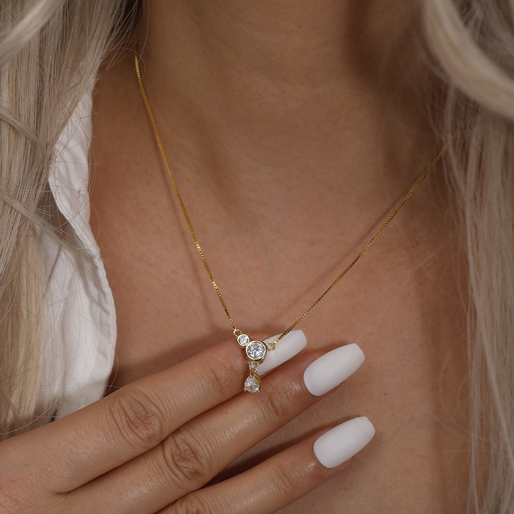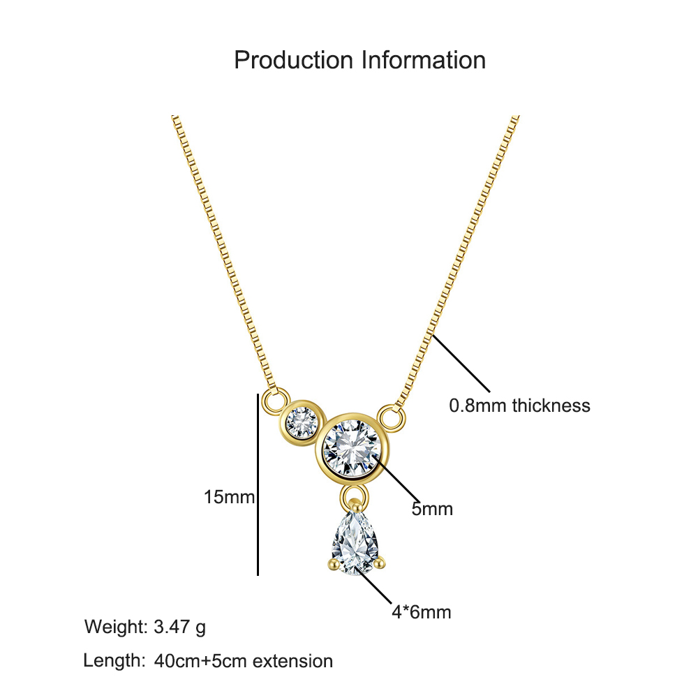 This elegant necklace is crafted from 925 sterling silver with a sleek gold-plated finish. Featuring a fine box chain and a sparkling zircon pendant with round and teardrop stones, it creates a refined and luxurious look. Perfect as a dainty choker or a stylish clavicle chain for both casual and dressy occasions.