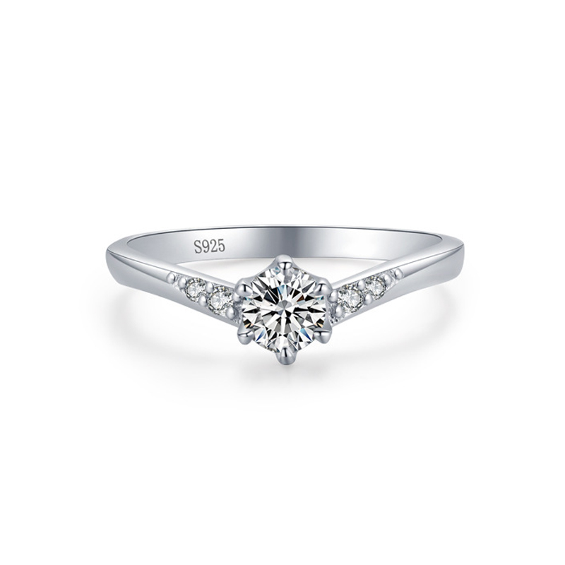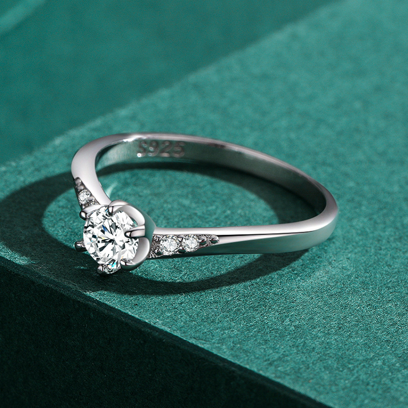 A perennial bestseller, this 925 sterling silver ring features a radiant round-cut cubic zirconia in a refined six-prong setting, complemented by side stones for extra sparkle. Finished with rhodium plating for durability and shine, this ring is a versatile addition to engagement, bridal, and fashion jewelry collections. A must-have style for retailers seeking high-quality silver jewelry that combines luxury and value.