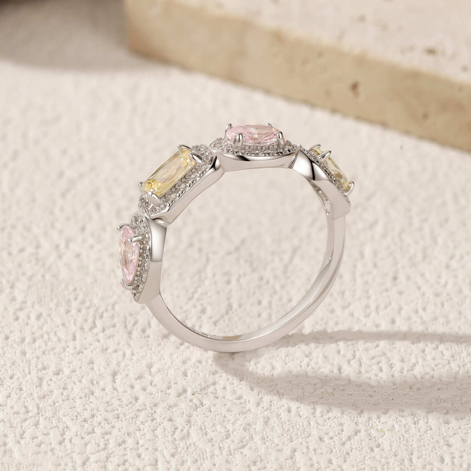 This playful yet elegant 925 sterling silver ring features a vibrant mix of pink and yellow cubic zirconia in oval and emerald cuts, each framed with shimmering pavé-set stones for extra brilliance. Inspired by sweet candy tones, this colorful zircon ring adds a lively touch to any outfit while maintaining a refined luxury feel. Perfect for daily wear, parties, or as a thoughtful gift, it's s a statement jewelry piece that blends fun with sophistication.