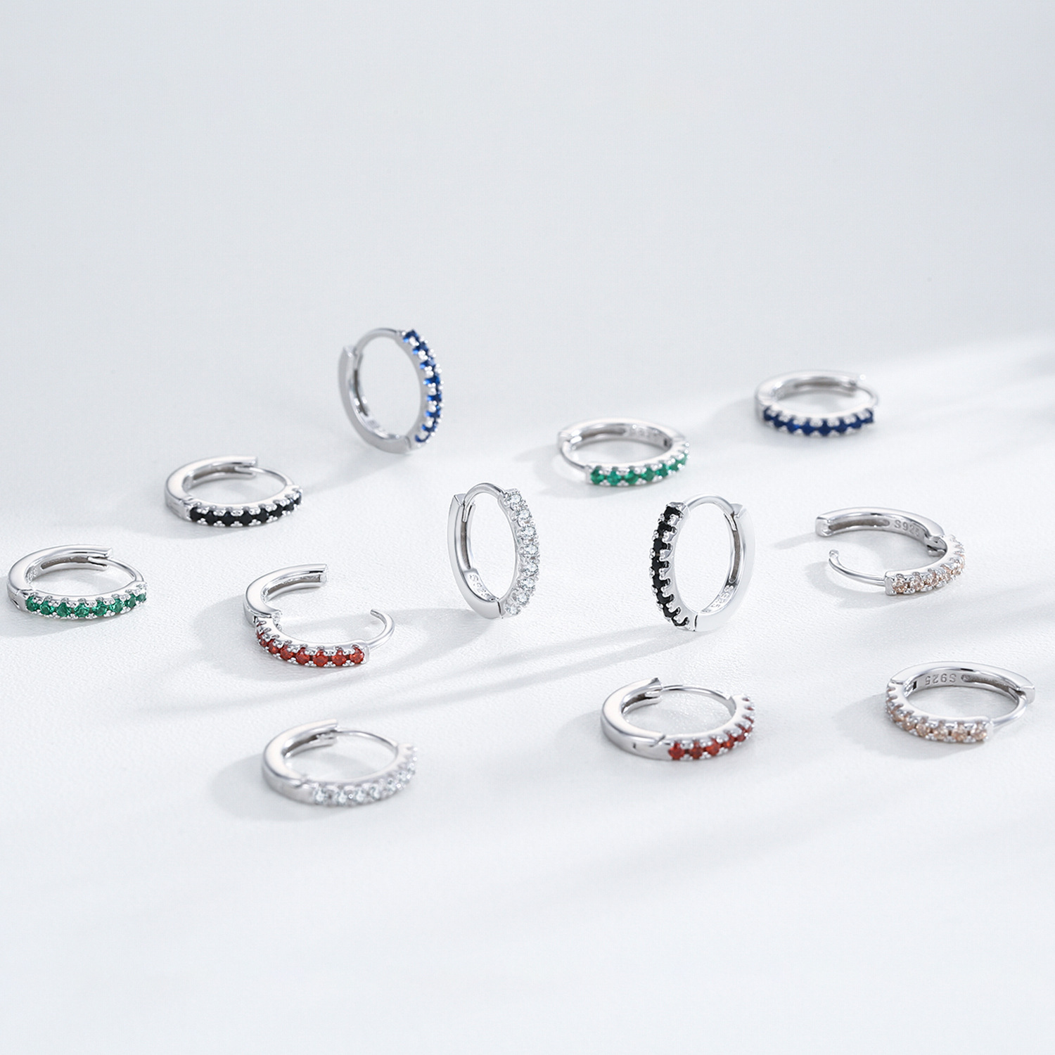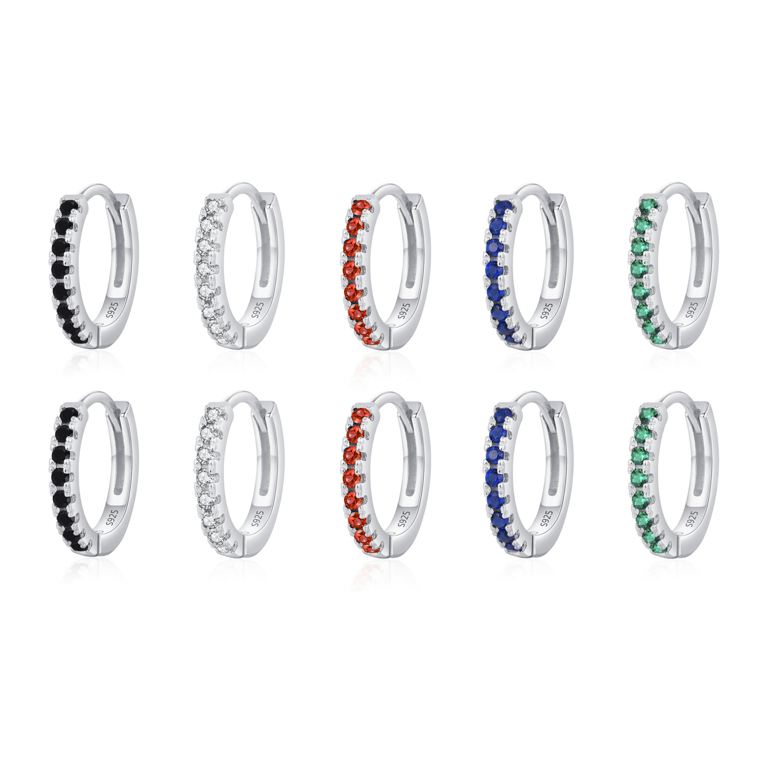 These wholesale 925 sterling silver hoops feature vivid zircon stones in five popular colors—black, white, red, blue, and green. Designed for easy retail turnover, they combine trendy color diversity with high-quality silver craftsmanship. Ideal for jewelry shops and online sellers seeking versatile summer earrings that appeal to fashion-forward customers worldwide.