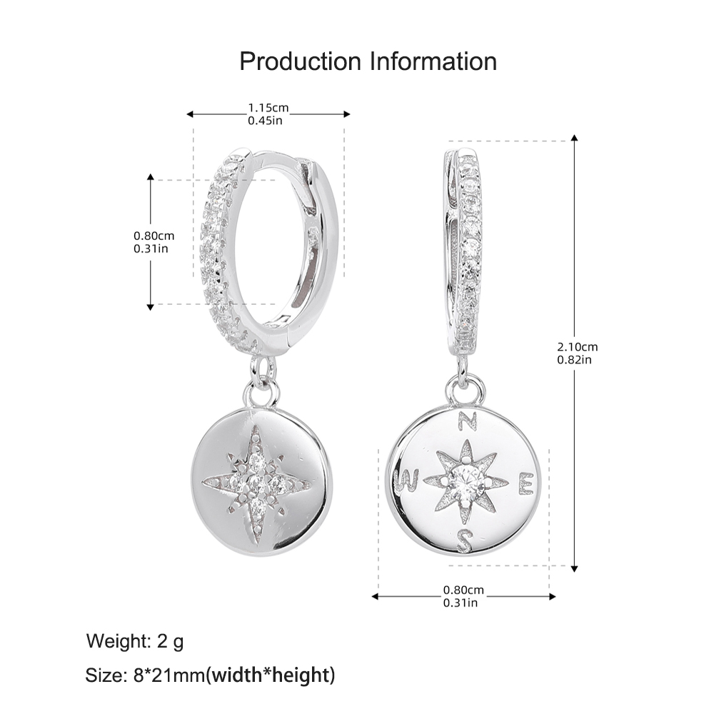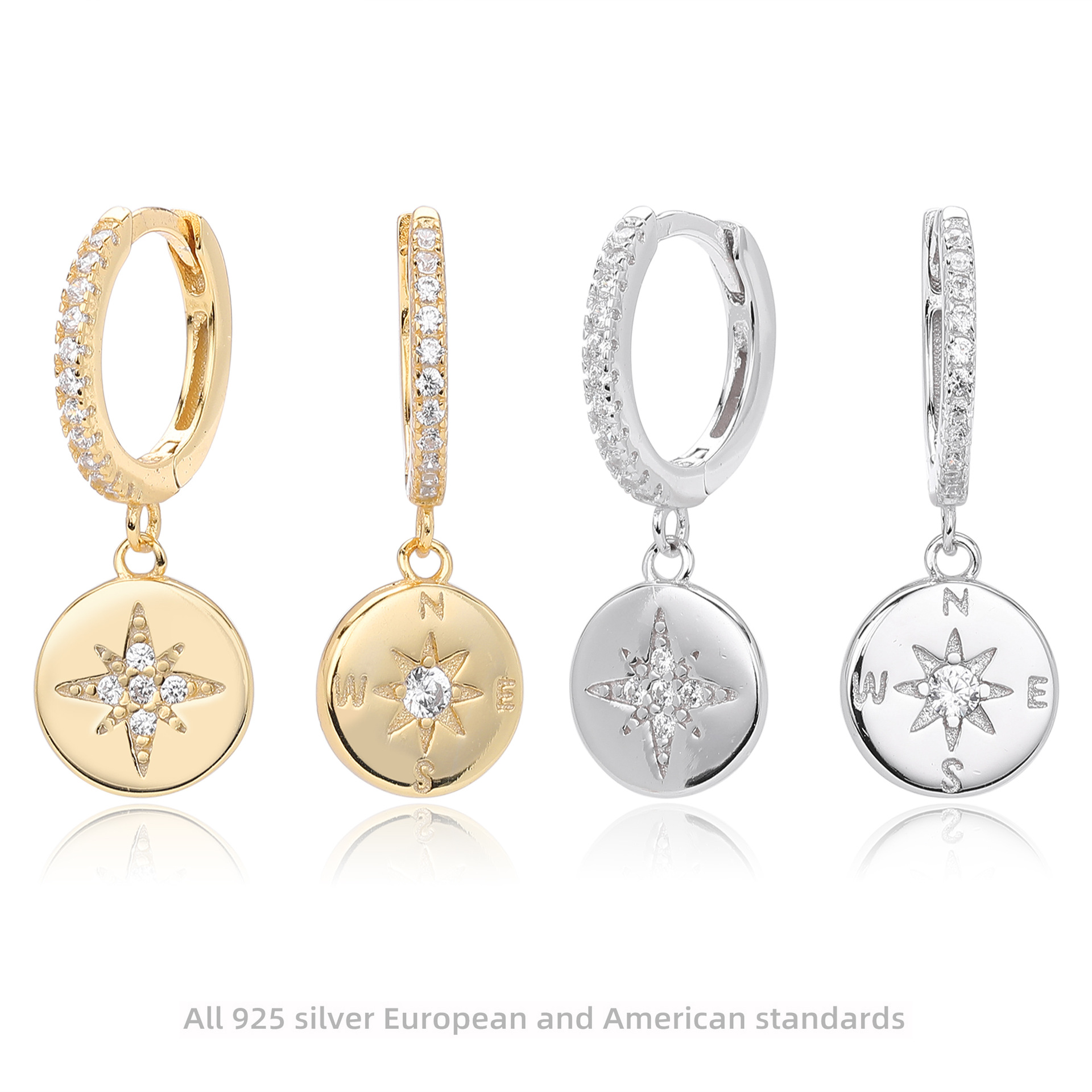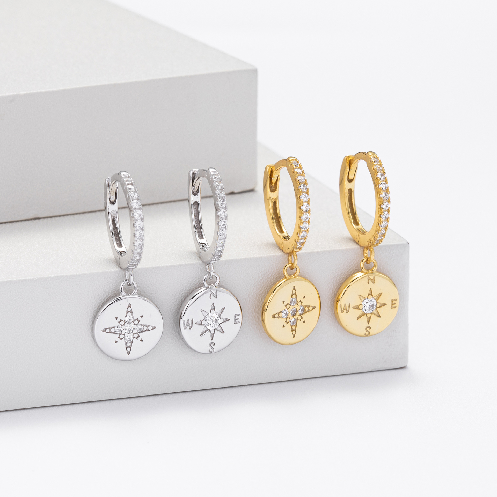 Expand your jewelry collection with these trendy 925 sterling silver compass star hoop earrings, available in gold and silver plating. Designed with micro-pavé cubic zirconia for extra sparkle, the eight-point star dangle is a symbolic and stylish design loved by customers worldwide. Meeting European and American standards, these earrings are durable, fashionable, and ideal for retailers, resellers, and online shops. Offered at competitive wholesale prices, they are a best-seller for bulk silver jewelry suppliers.