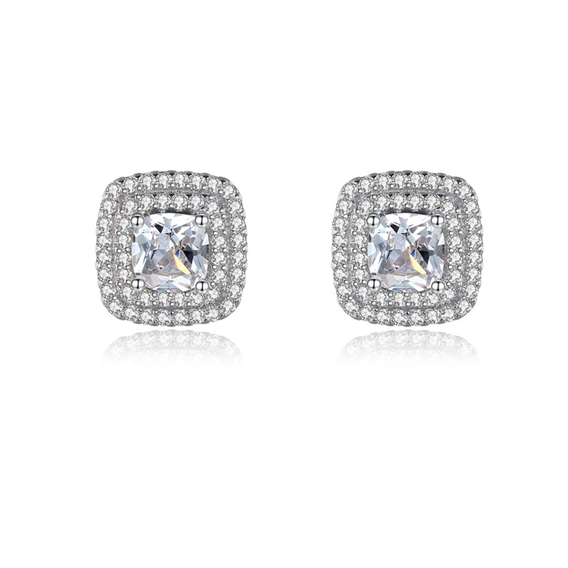 These wholesale 925 sterling silver zircon stud earrings feature a dazzling cushion-cut centerpiece surrounded by a double halo of sparkling stones. The four-prong design and high-polish finish create a premium jewelry look that appeals to both modern and classic tastes. A perfect addition for jewelry retailers, boutiques, and online stores looking for best-selling luxury-inspired pieces with lasting shine and elegance.