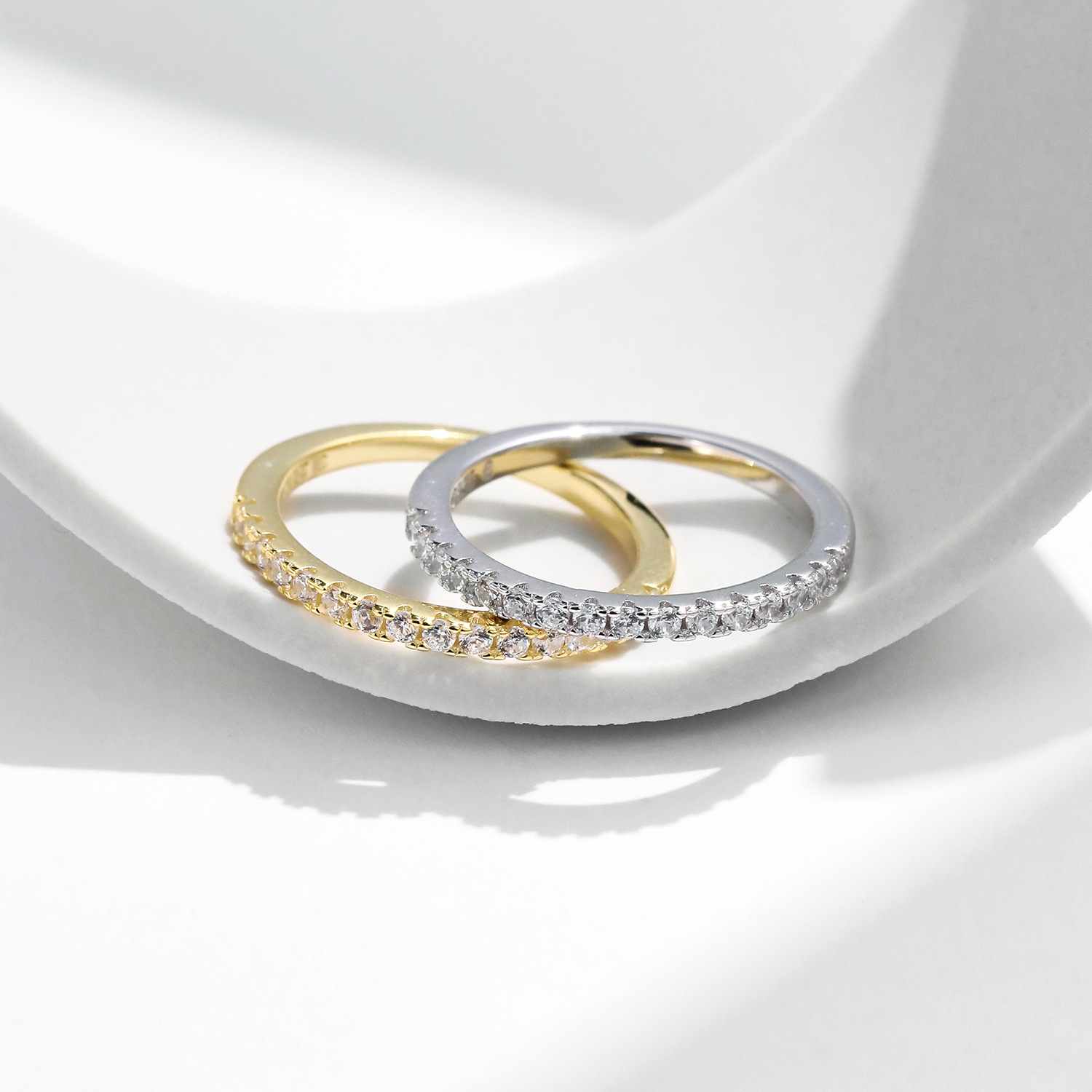 Elegant and versatile, this 925 sterling silver band ring is adorned with a row of brilliant pave-set cubic zirconia stones, delivering maximum sparkle in a slim and refined design. Available in both silver and 18K gold plating, this ring is perfect for daily office wear, evening events, or stacking with other rings to create a chic layered look. Its minimalist yet dazzling style makes it a timeless piece of women's fashion jewelry suitable for both classic and modern wardrobes.