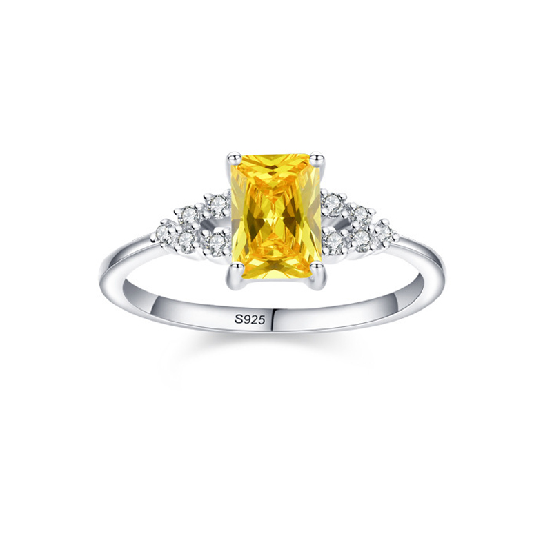 This radiant 925 sterling silver ring features a yellow emerald-cut cubic zirconia centerpiece accented by brilliant micro CZ stones. Its bold yet refined style makes it a must-have for jewelry retailers looking to add colorful statement pieces to their collections. Rhodium-plated for long-lasting shine, this design combines vibrant color with luxury craftsmanship — ideal for engagement-style, fashion, or seasonal jewelry lines.