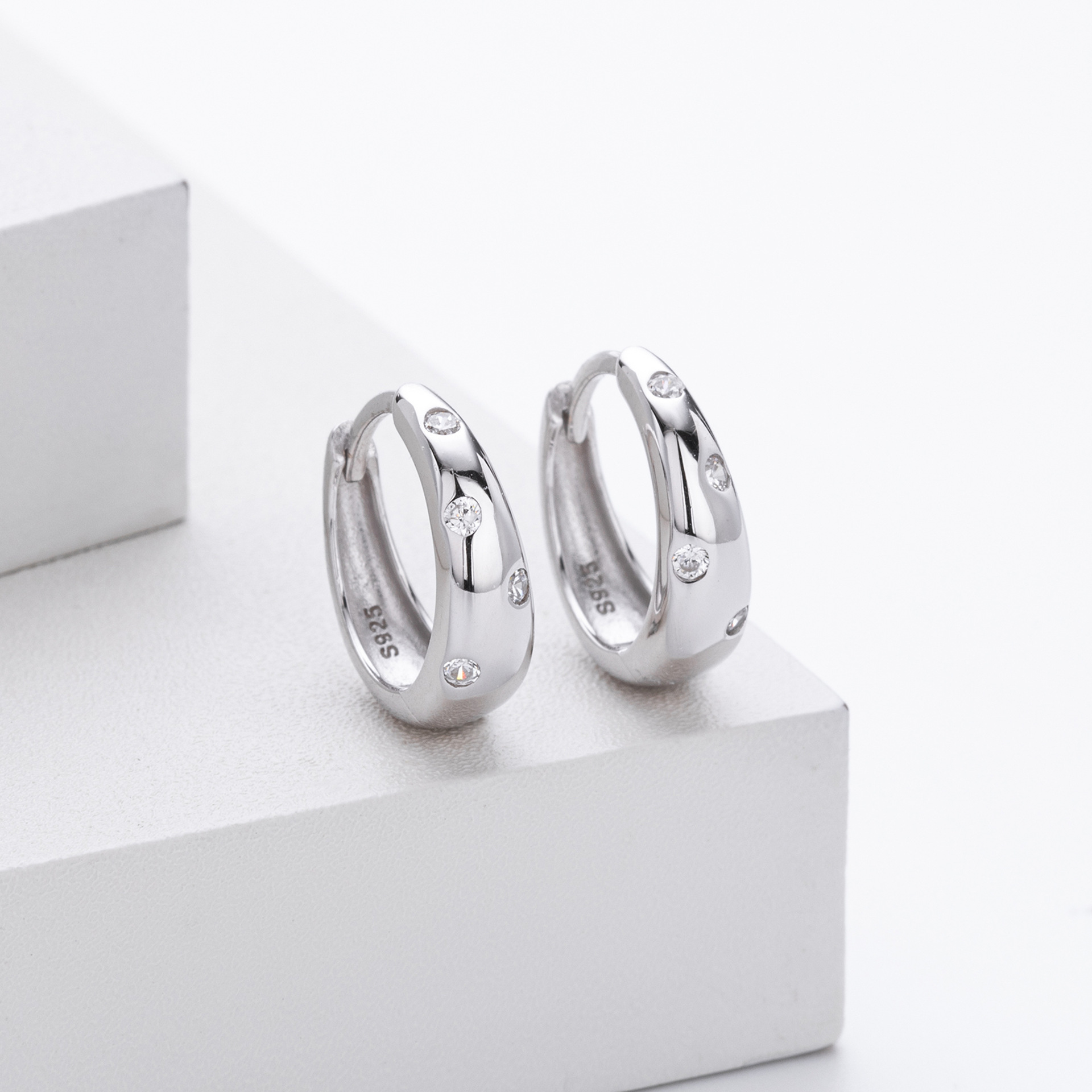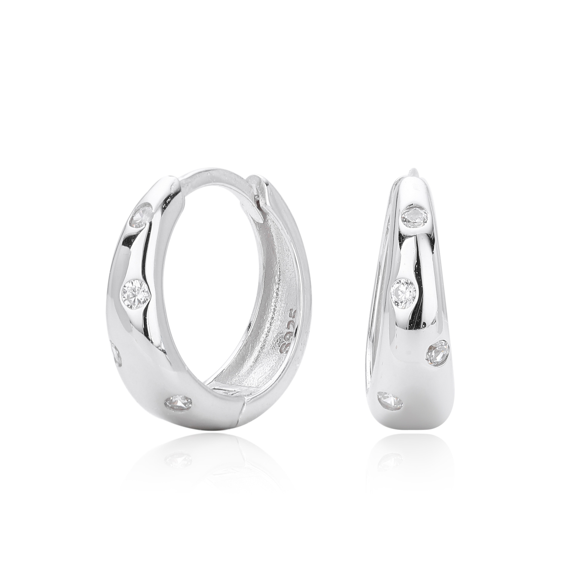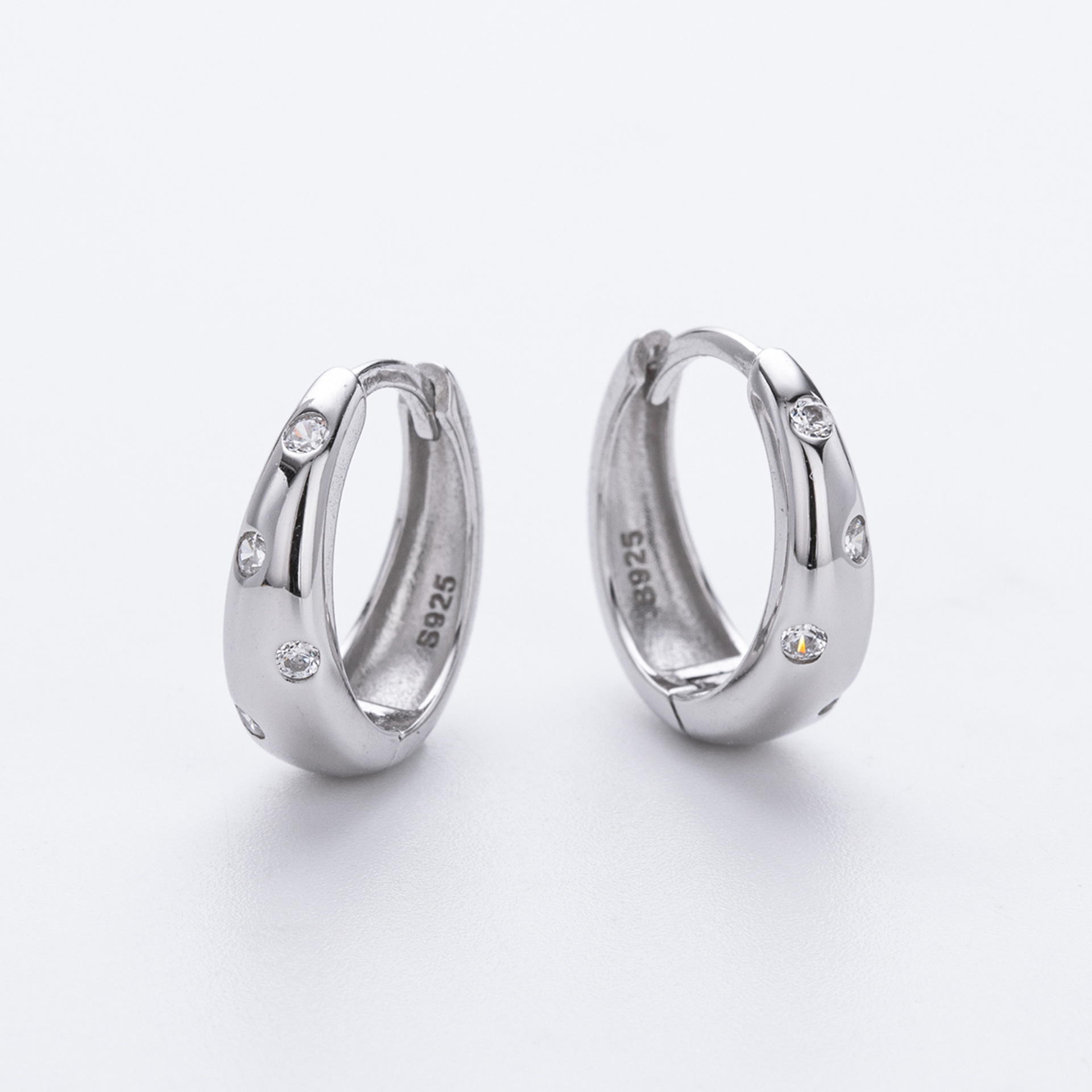 Update your minimalist category with our Wholesale 925 Sterling Silver Flush Set Tapered Hoops. The "Flush" or "Gypsy" setting is a key trend in current jewelry design, favored for its clean lines and durability (no prongs to catch on clothing). This SKU features a "Tapered" or bottom-heavy hoop shape that offers a substantial look without excessive weight. The scattered placement of the Cubic Zirconia adds a unique design element that differentiates these from standard huggies. Manufactured from solid S925 sterling silver, they are a high-quality staple for "Quiet Luxury" collections.