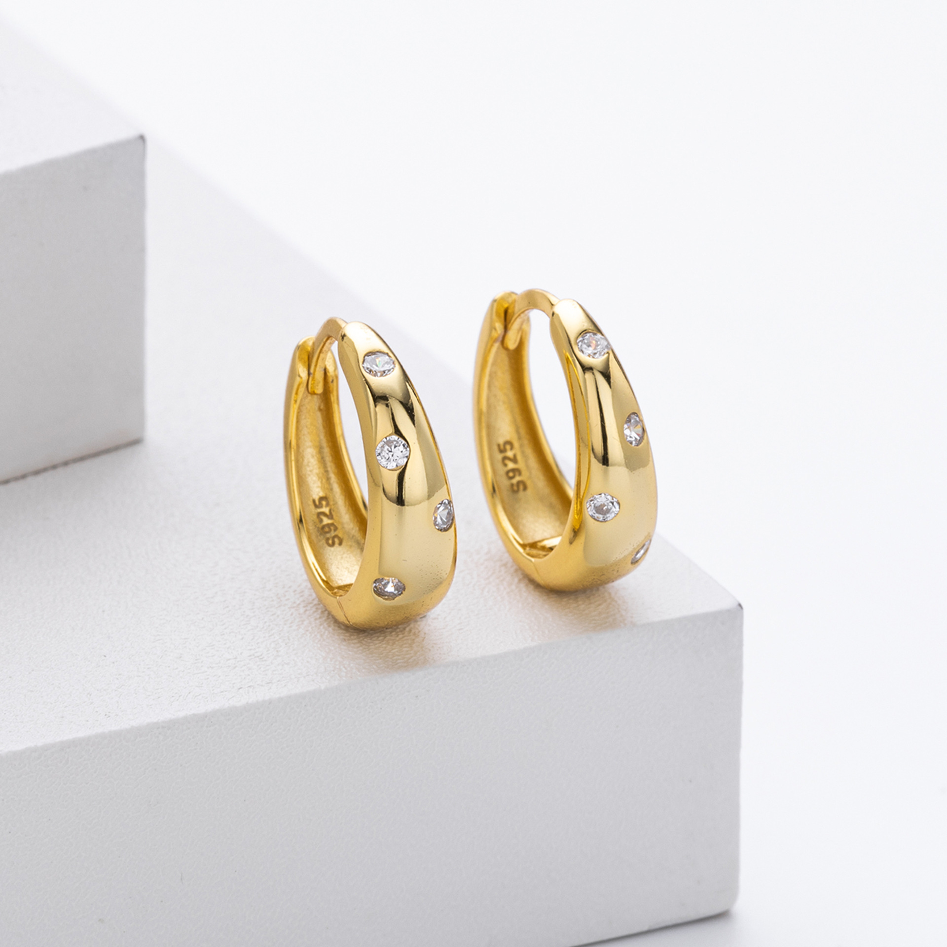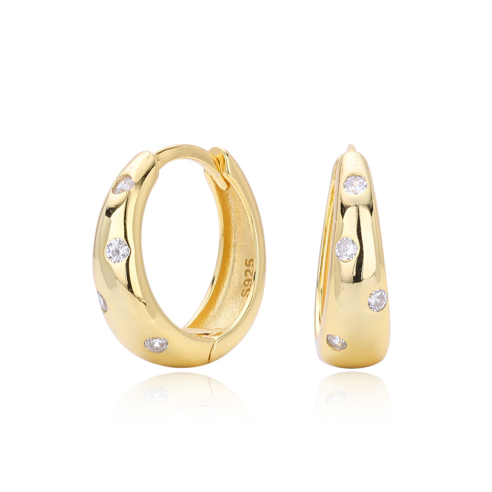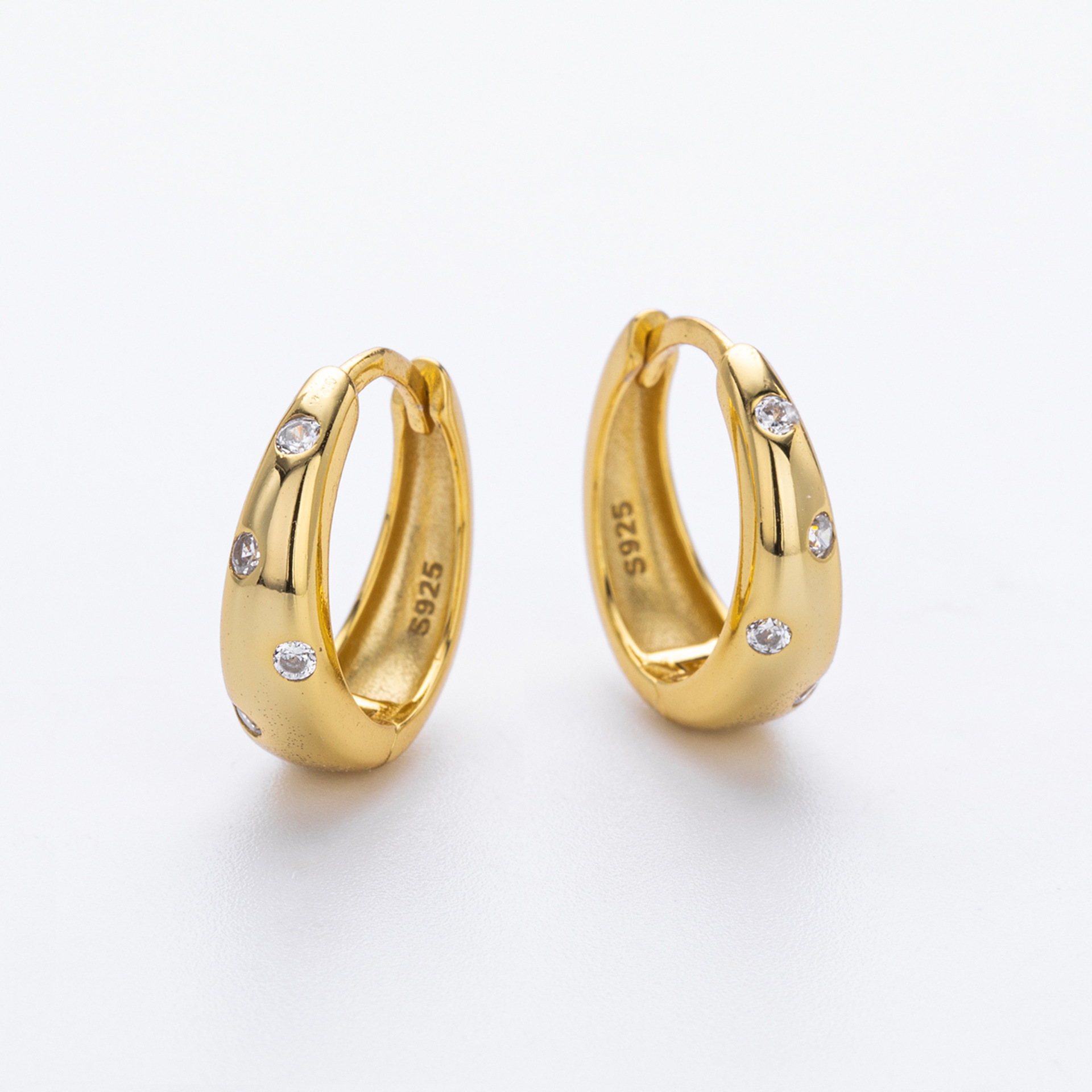 Update your minimalist category with our Wholesale 925 Sterling Silver Flush Set Tapered Hoops. The "Flush" or "Gypsy" setting is a key trend in current jewelry design, favored for its clean lines and durability (no prongs to catch on clothing). This SKU features a "Tapered" or bottom-heavy hoop shape that offers a substantial look without excessive weight. The scattered placement of the Cubic Zirconia adds a unique design element that differentiates these from standard huggies. Manufactured from solid S925 sterling silver, they are a high-quality staple for "Quiet Luxury" collections.