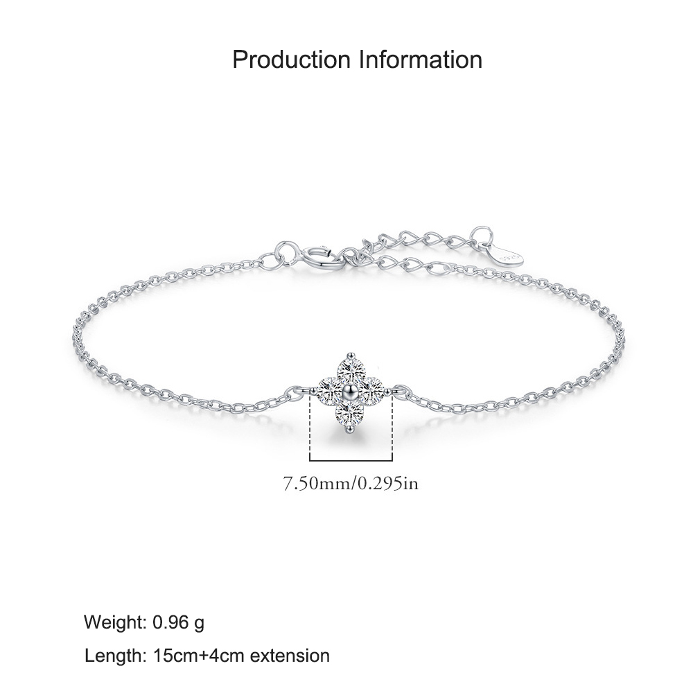 Delicate and radiant, this 925 sterling silver bracelet features a refined four-leaf clover design set with sparkling cubic zirconia stones. The symmetrical floral pattern adds a touch of luck and elegance, while the slim chain ensures a lightweight, comfortable fit. Perfect for layering or wearing solo, this trendy piece effortlessly complements any modern outfit. Ideal for gifting or everyday wear.