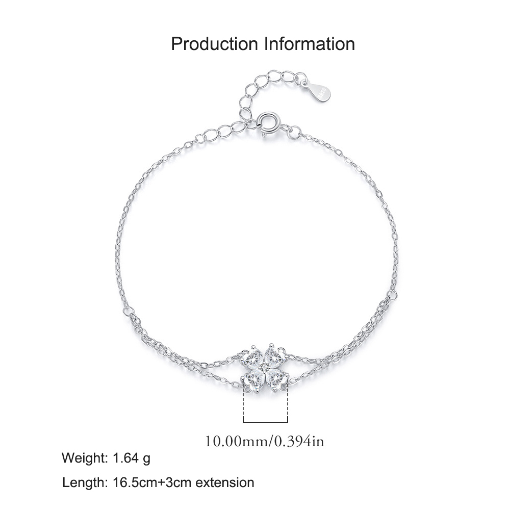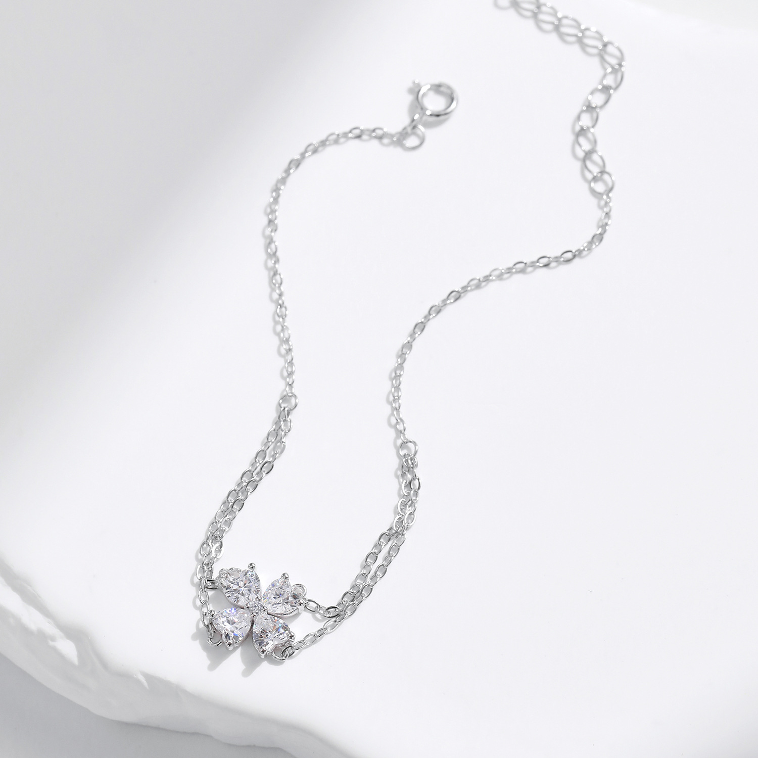 This refined bracelet showcases a four-leaf clover motif crafted from sparkling heart-shaped cubic zirconia, symbolizing luck and love. Made from high-quality 925 sterling silver, it features a delicate double chain design that adds depth and sophistication. Its dainty profile makes it perfect for stacking or wearing alone as a subtle statement. A beautiful gift or daily accessory for women who adore romantic, minimalist styles.