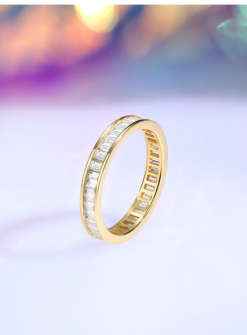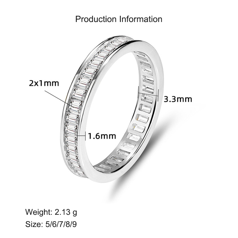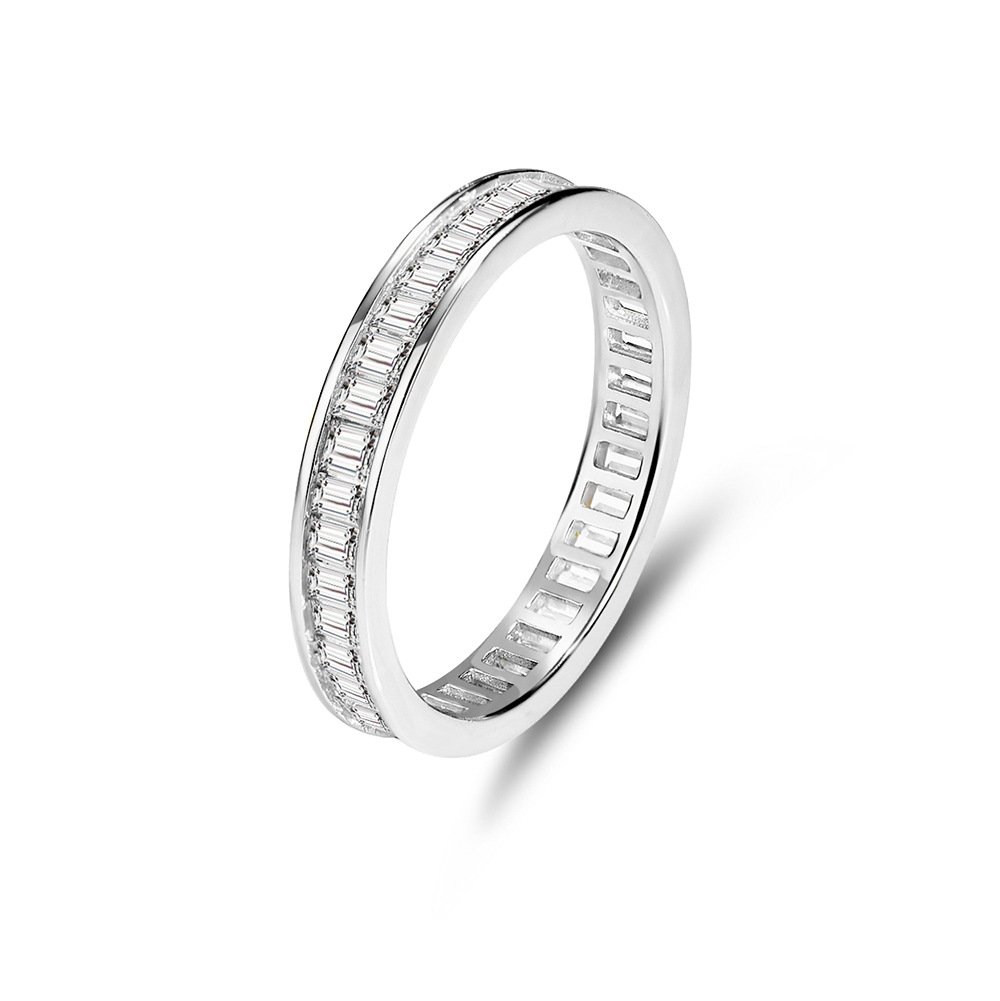 Crafted from premium 925 sterling silver, this full eternity ring features a seamless row of baguette-cut cubic zirconia stones set in a precise channel setting. The clean, modern lines and continuous sparkle make it ideal as a stacking ring, minimalist wedding band, or statement piece for any jewelry collection. A timeless favorite for those who appreciate sleek luxury and fine craftsmanship in wholesale 925 silver jewelry.