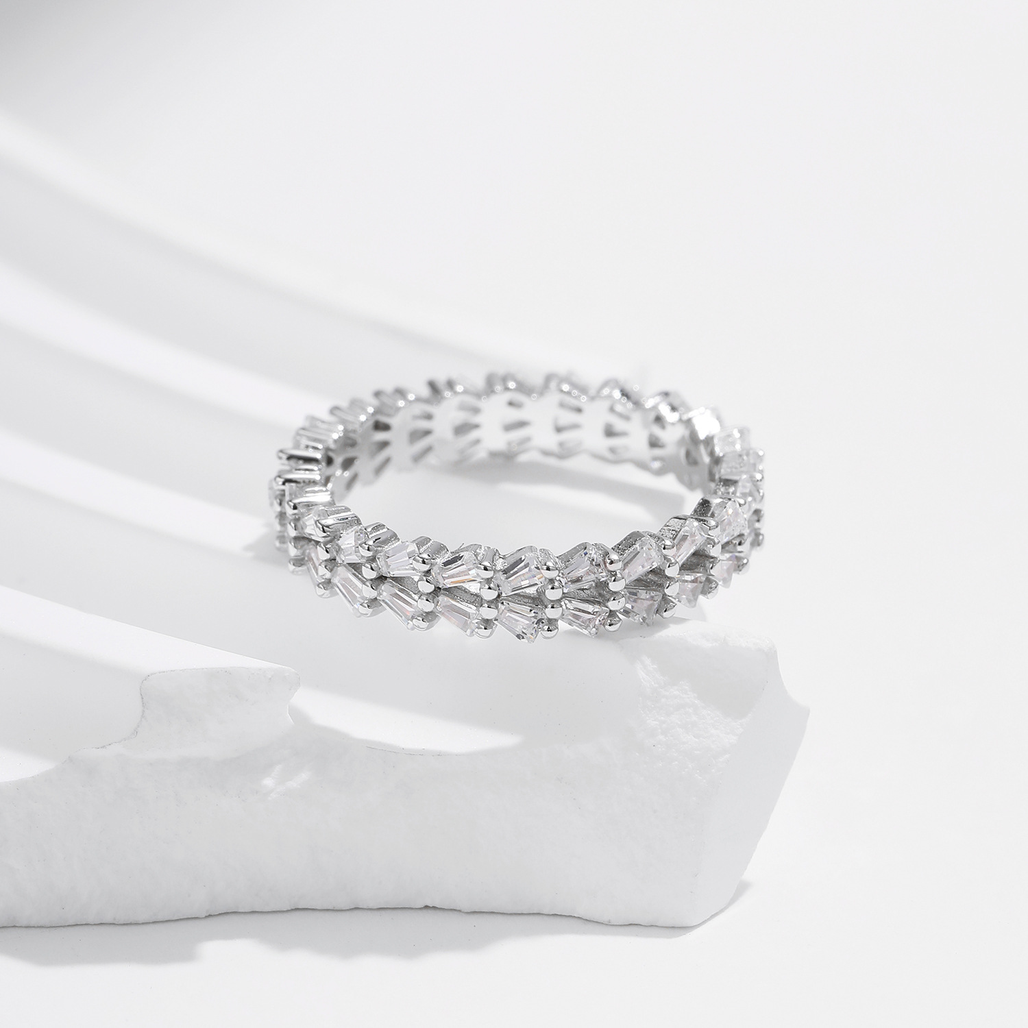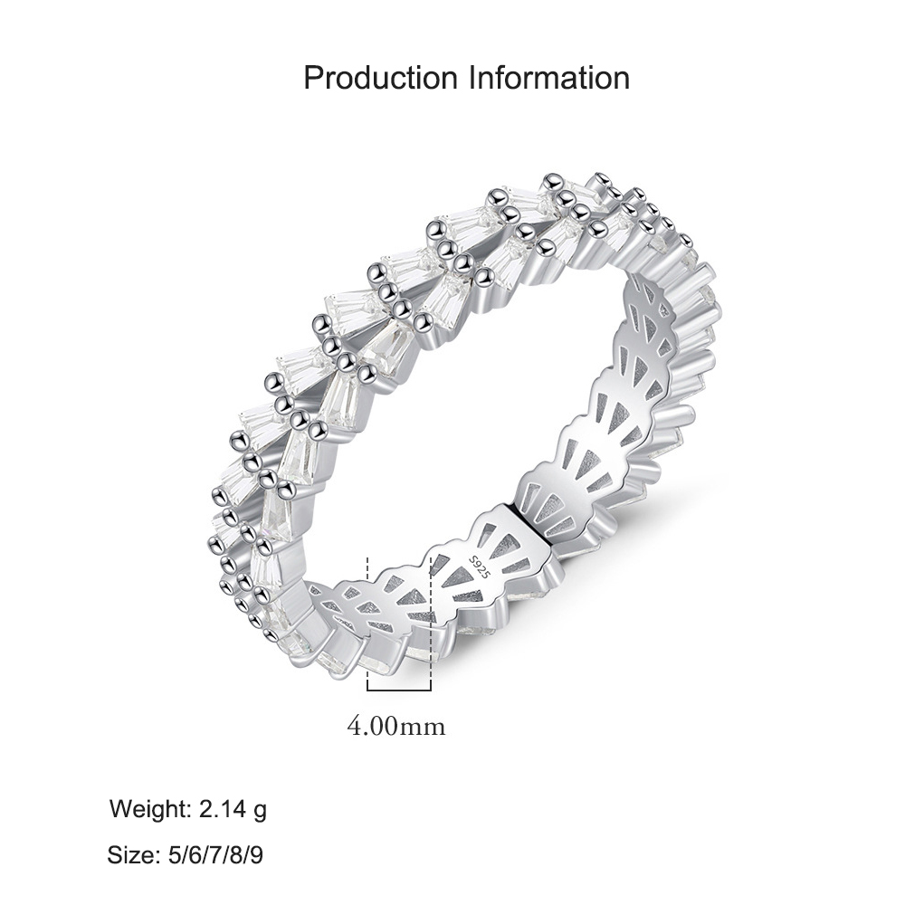 Shine bright with this 925 sterling silver eternity band, featuring a continuous row of brilliant baguette-cut cubic zirconia stones for maximum sparkle. Designed in a chic European and INS-inspired style, this full pave ring delivers luxury and modern elegance. Perfect as a statement ring, cocktail ring, or stackable band, it adds eye-catching glamour to both daily wear and special occasions. A versatile piece of women’s fashion jewelry that pairs beautifully with other silver rings or stands out on its own. Ideal for gifting anniversaries, birthdays, or weddings.