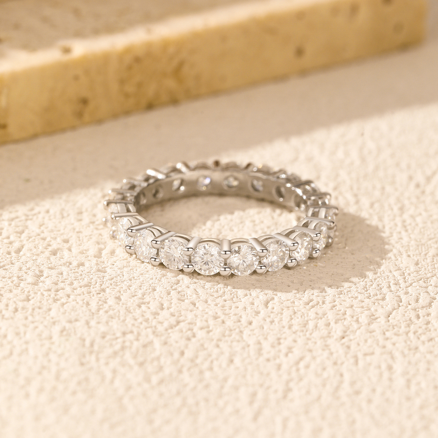 Stock the ultimate symbol of commitment with our Wholesale 925 Sterling Silver Full Eternity Moissanite Band. Eternity rings are a perennial best-seller in the bridal and fine jewelry market. This SKU features high-grade round Moissanite stones set along the entire circumference of the band, offering the luxurious look of a full diamond eternity ring at an accessible price point. Manufactured from solid S925 sterling silver, it is a high-value item that appeals to customers looking for premium stackable rings or alternative bridal jewelry.