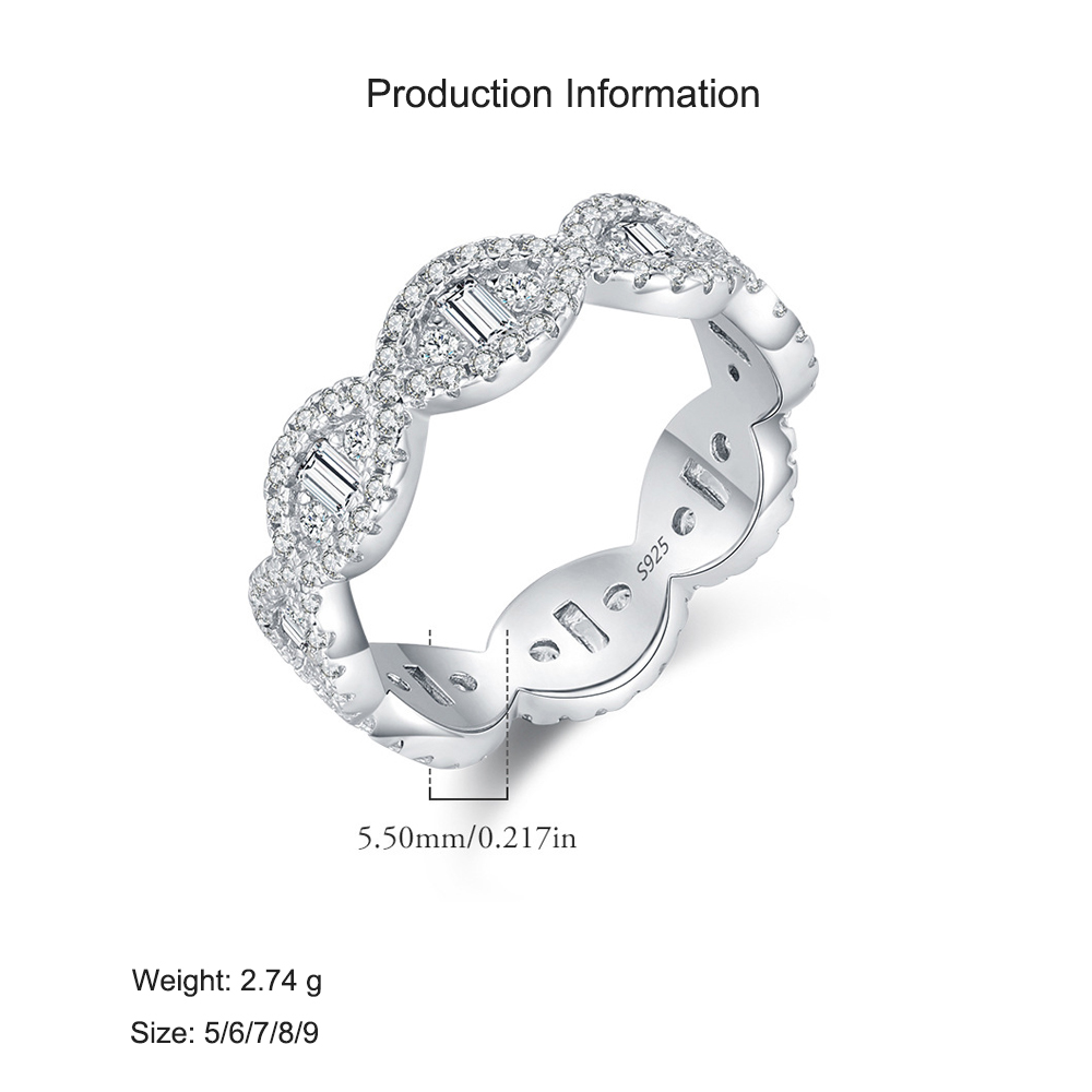 This exquisite 925 sterling silver eternity band ring is designed with a luxurious full pavé setting, featuring alternating round and baguette-cut cubic zirconia for maximum brilliance. The continuous loop of dazzling stones creates a radiant shine that captures light from every angle, making it a true statement piece. With its refined craftsmanship and lightweight luxury design, this silver ring is perfect for stacking, wearing alone, or gifting on special occasions. A timeless yet trendy piece of jewelry that adds sophistication to any look.
