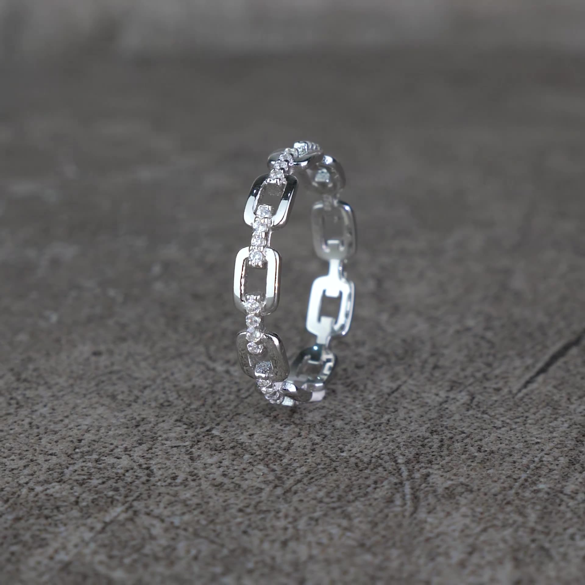 This 925 sterling silver chain-link ring merges urban chic with timeless sophistication. The unique open-link pattern, accented by shimmering CZ stones, makes it a best-seller in contemporary jewelry collections. Rhodium-plated for durability and long-lasting brilliance, it is ideal for retailers seeking modern, fashion-forward sterling silver pieces.