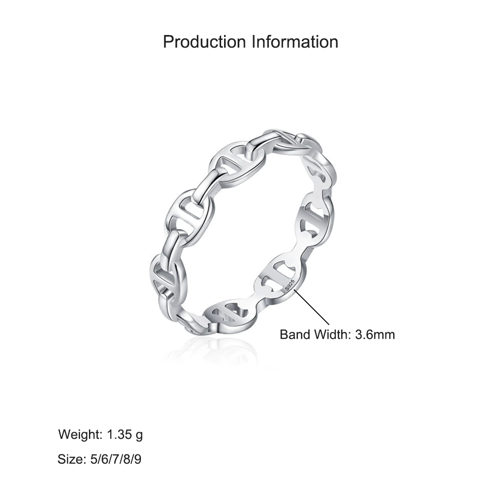 Chic and timeless, this 925 sterling silver geometric chain ring features a sleek linked design that embodies effortless modern elegance. The open-link pattern adds dimension and texture, while the high-polish finish enhances its refined simplicity. Crafted from genuine sterling silver and plated with rhodium for lasting shine, this minimalist band is comfortable, durable, and perfect for daily wear or stacking with other rings. A stylish piece that transitions seamlessly from casual to formal looks.