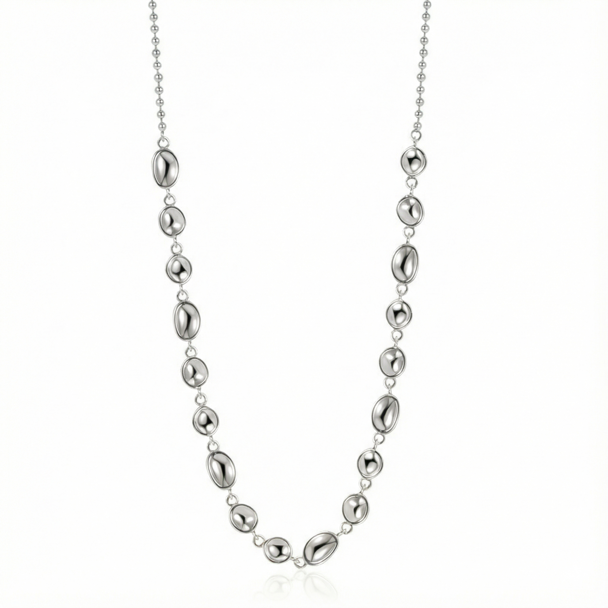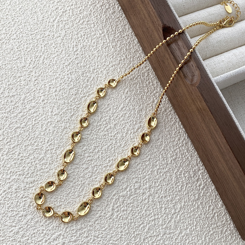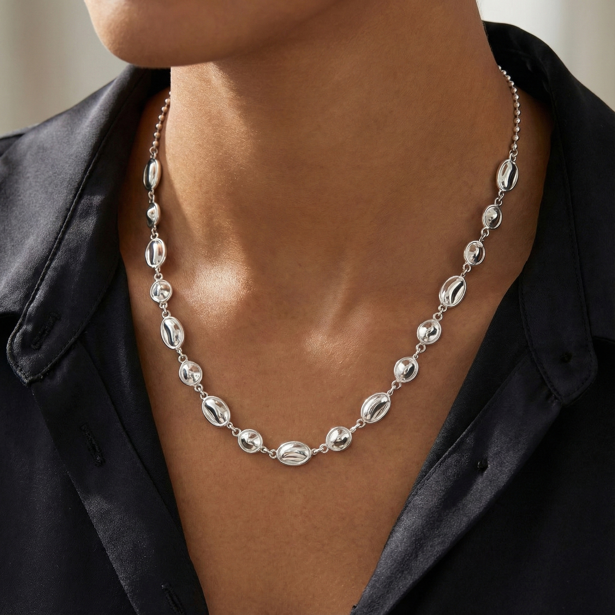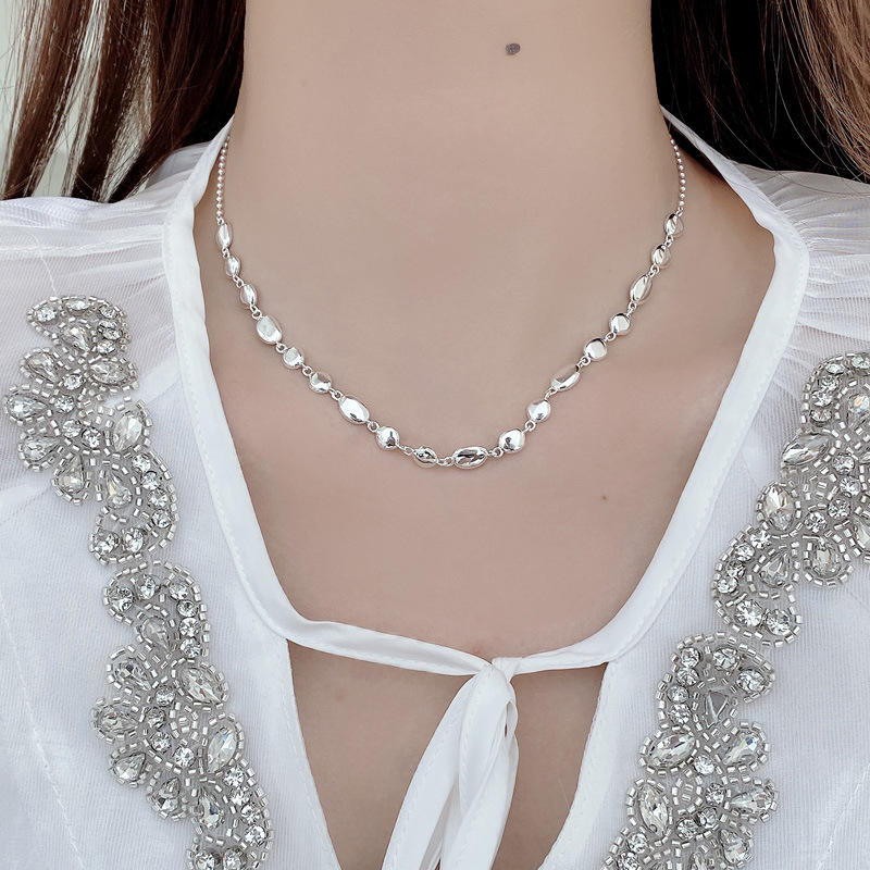 Stock the "Sculptural Jewelry" trend that is dominating social media with our Wholesale 925 Sterling Silver Concave Organic Bean Choker. This SKU stands out by combining two popular elements: the "Molten Metal" aesthetic seen in the irregular, concave links, and the "Beaded Chain" used for the back closure. The mixed-texture design appeals to customers seeking "Artsy Minimalist" jewelry that feels handcrafted and unique. Manufactured from solid S925 sterling silver, it is a versatile, high-margin item that complements both casual and dressy assortments.
