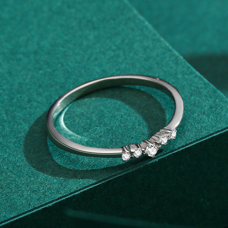 A timeless bestseller for minimalist collections, this 925 sterling silver geometric ring features a sleek V-shaped design with five micro-set cubic zirconia stones. Rhodium-plated for extra durability and shine, this delicate band is ideal for stacking sets, fashion jewelry lines, or everyday accessory collections. Lightweight, refined, and perfectly suited for modern jewelry displays.