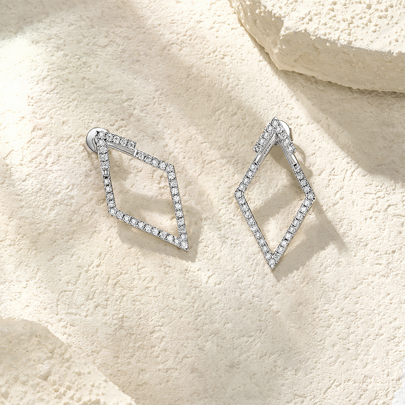 These striking 925 sterling silver earrings feature an exaggerated geometric rhombus-shaped hollow design, fully encrusted with sparkling moissanite stones. Bold yet elegant, they are the perfect statement earrings to elevate evening wear, cocktail looks, or high-fashion outfits.