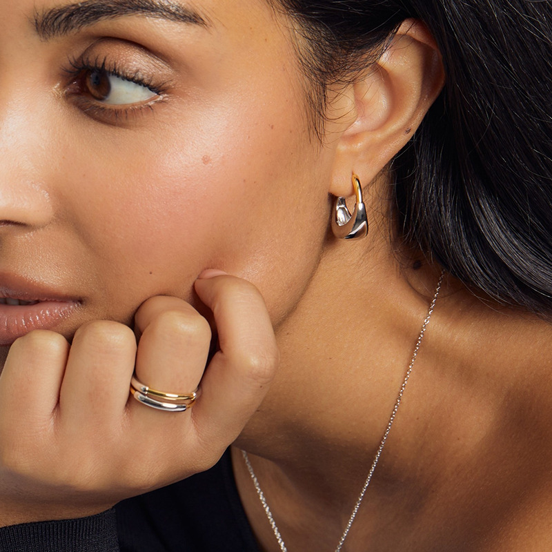 Source a trending, high-impact inventory item with our 925 Sterling Silver Geometric Two-Tone Huggie Hoop Earrings. This design is highly marketable, capitalizing on the popularity of geometric jewelry and the highly sought-after contrast two-tone aesthetic, which appeals to customers seeking versatile pieces that mix gold and silver. The bold shape and secure huggie hoop style ensure strong aesthetic value and consumer appeal. Crafted from authentic 925 sterling silver, this piece offers reliable quality and strong retail margins. These are excellent, reliable, fast-selling staple pieces for bulk purchase. Available for competitive wholesale pricing.