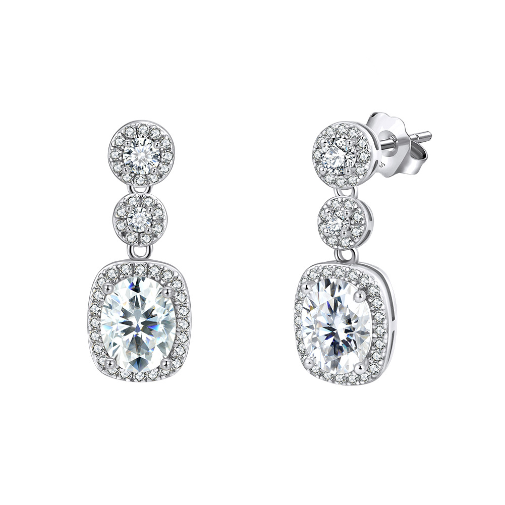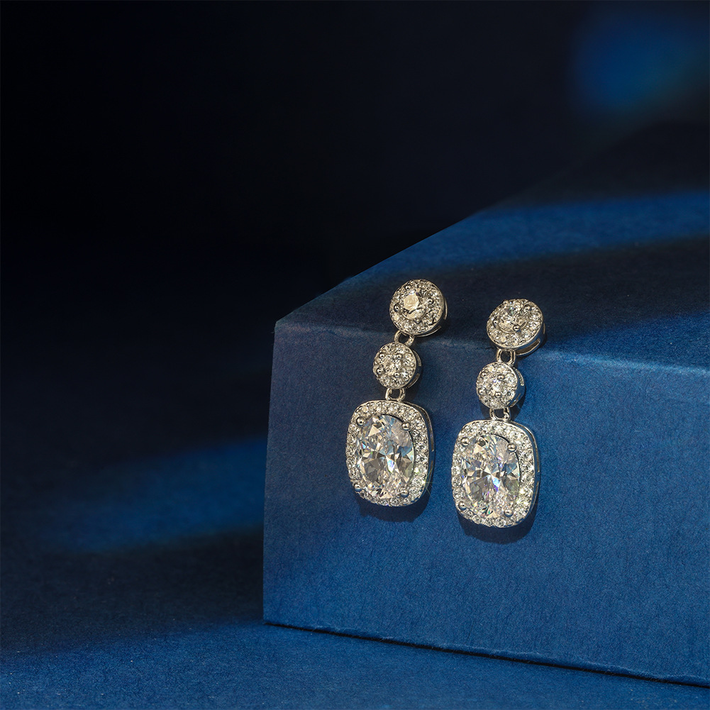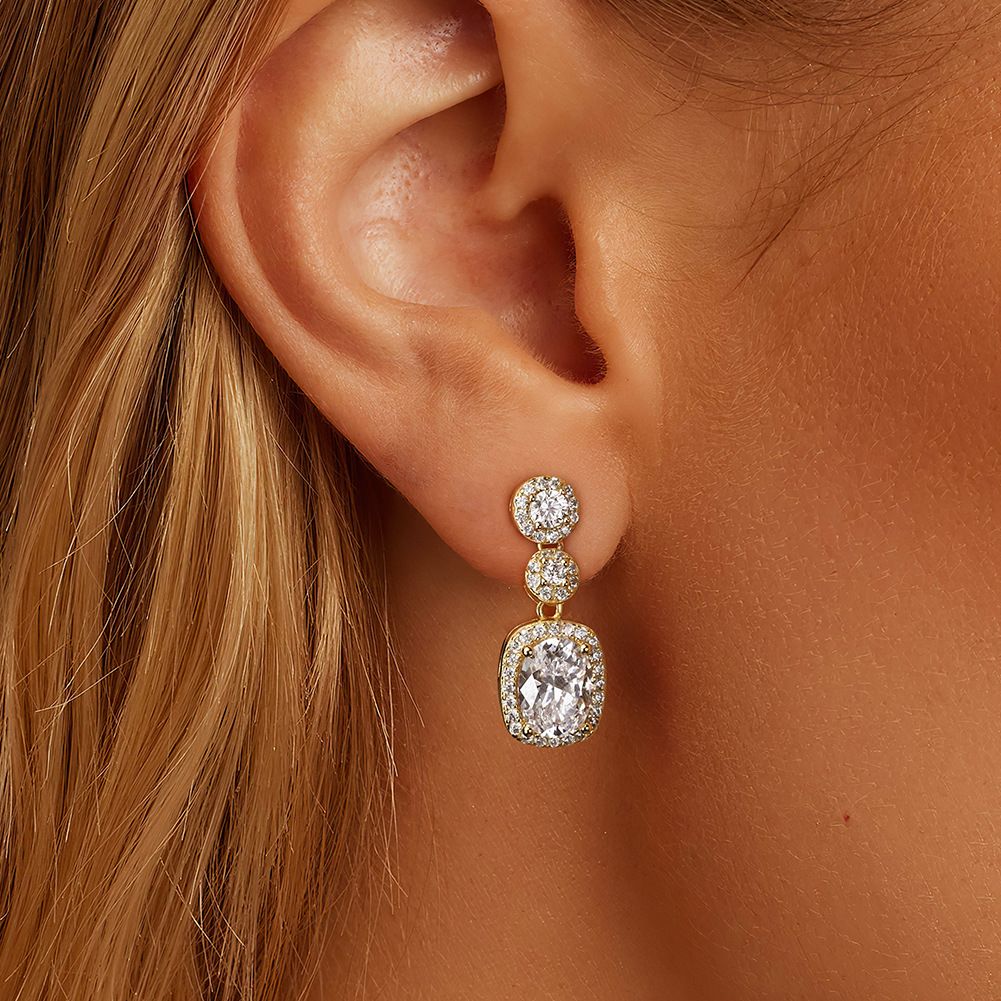 These wholesale earrings showcase a cushion-cut zircon framed with halos of pavé-set stones, designed with a triple-drop structure for added sparkle. Crafted in gold-plated sterling silver, this design is a customer favorite for bridal, event, and evening jewelry collections.