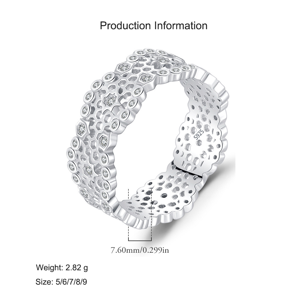 Elevate your collection with this intricately designed 925 sterling silver honeycomb ring, featuring a unique lace-cutout pattern accented by brilliant cubic zirconia stones. The wide band showcases a blend of modern geometry and delicate femininity, making it a perfect choice for fashion-forward women. Crafted from genuine S925 silver, this ring offers both durability and luxurious shine.