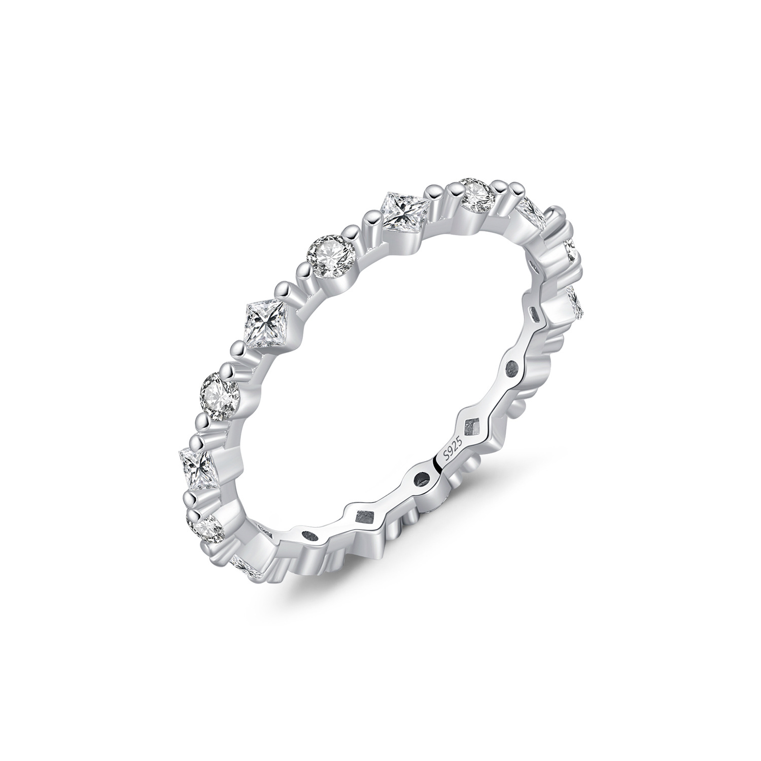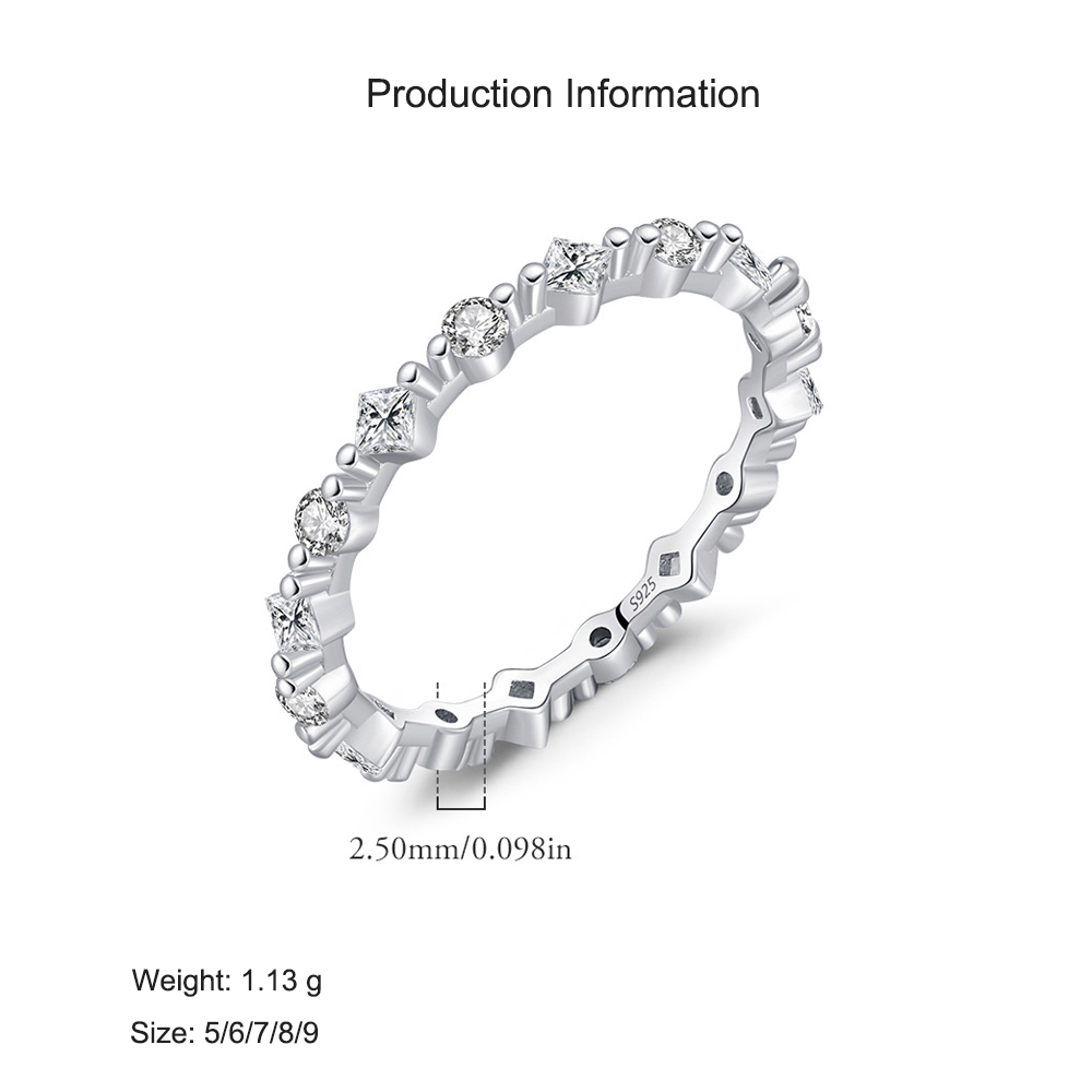 This 925 sterling silver ring features a chic irregular zircon arrangement, combining round and square-cut stones for a modern, geometric look. The slim band design makes it versatile for stacking or wearing alone, adding a subtle sparkle to any outfit. Perfect as a fashionable index finger ring, minimalist wedding band, or everyday accessory, this silver ring blends elegance with contemporary style. A must-have piece of fine jewelry for those who love unique yet timeless designs.