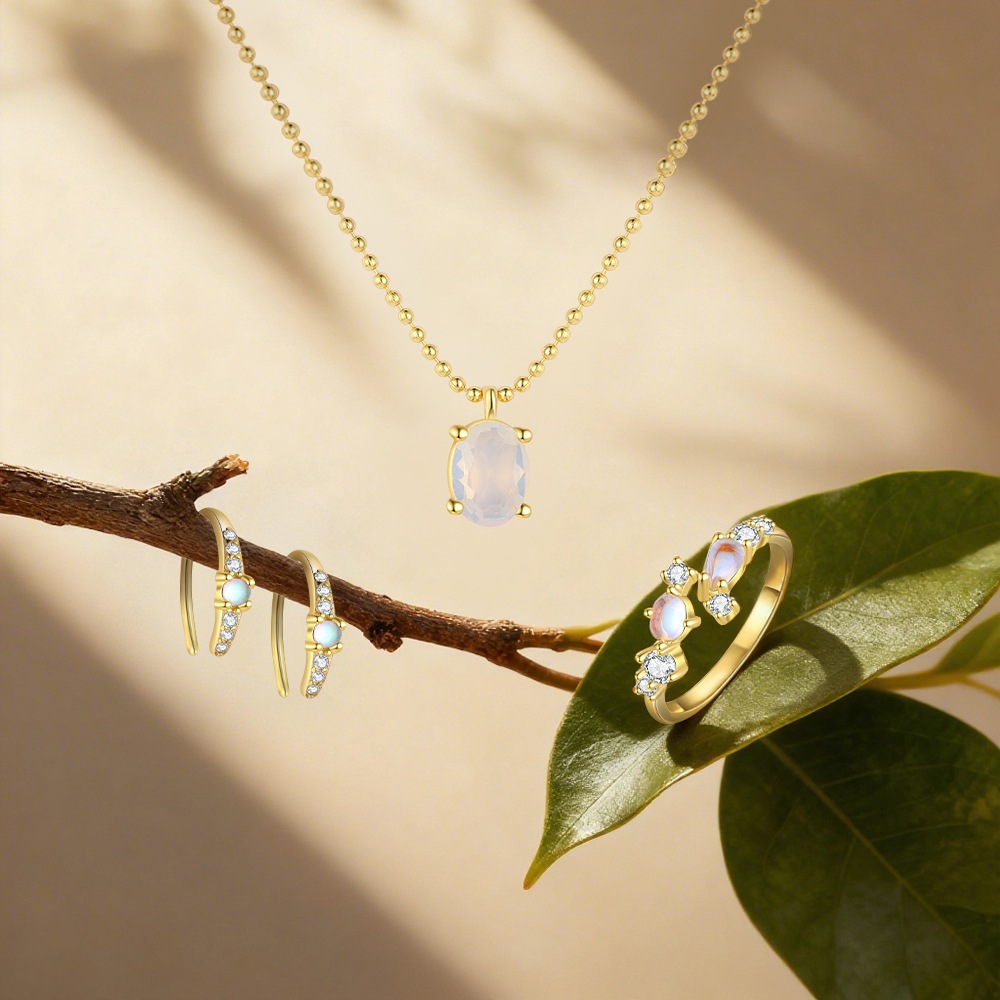 Offer your customers a complete "Boho-Chic" look with our Wholesale 925 Sterling Silver Layered Synthetic Moonstone Jewelry Set. This SKU is a high-value bundle that includes three key categories: a "Layered/Stacked" necklace with popular beaded chain details, a pair of modern arc earrings, and an adjustable ring. The "Synthetic Moonstone" offers the coveted blue-sheen iridescence at a price point that ensures excellent margins. Manufactured from solid S925 sterling silver, this pre-curated set simplifies the shopping experience and drives higher unit sales.