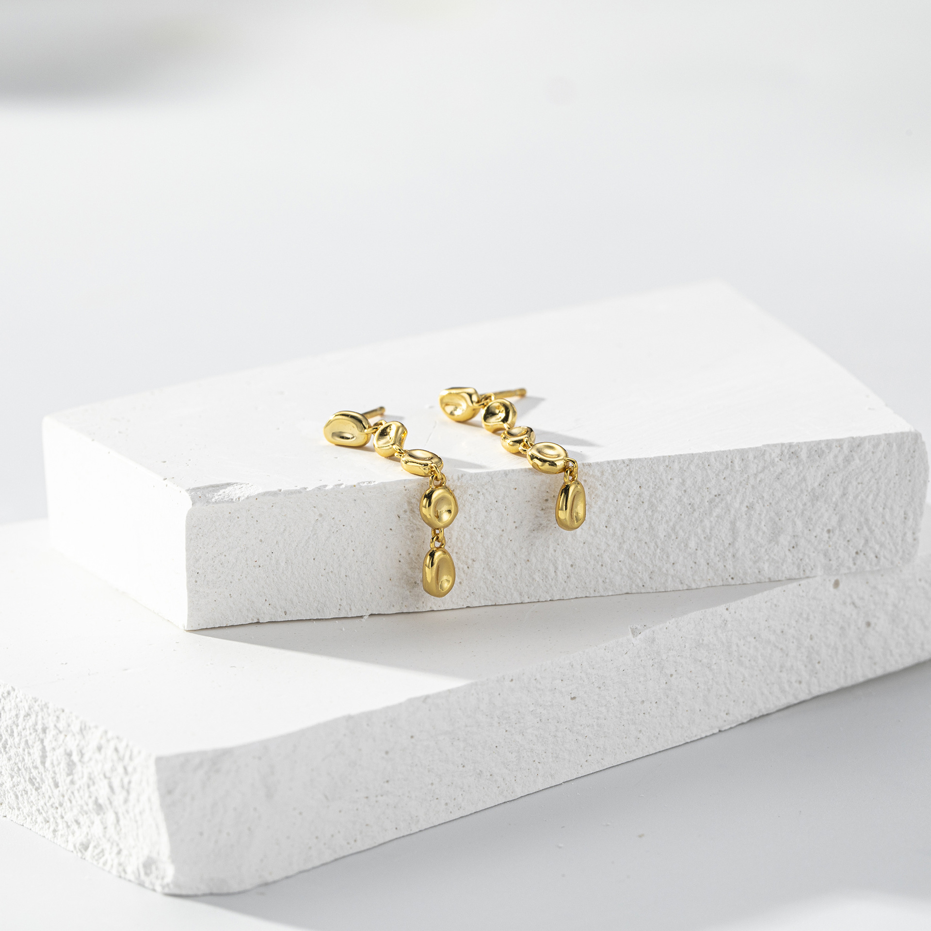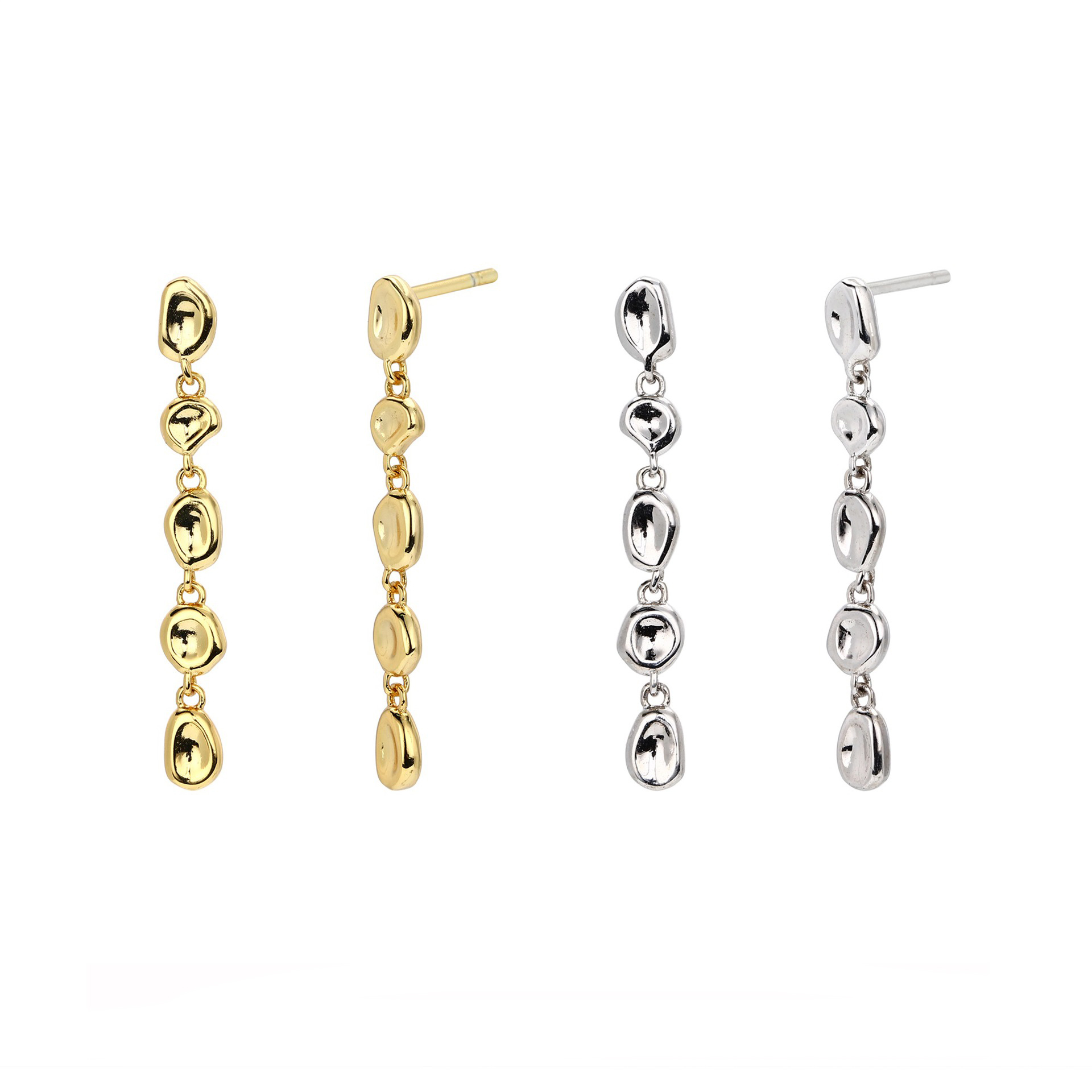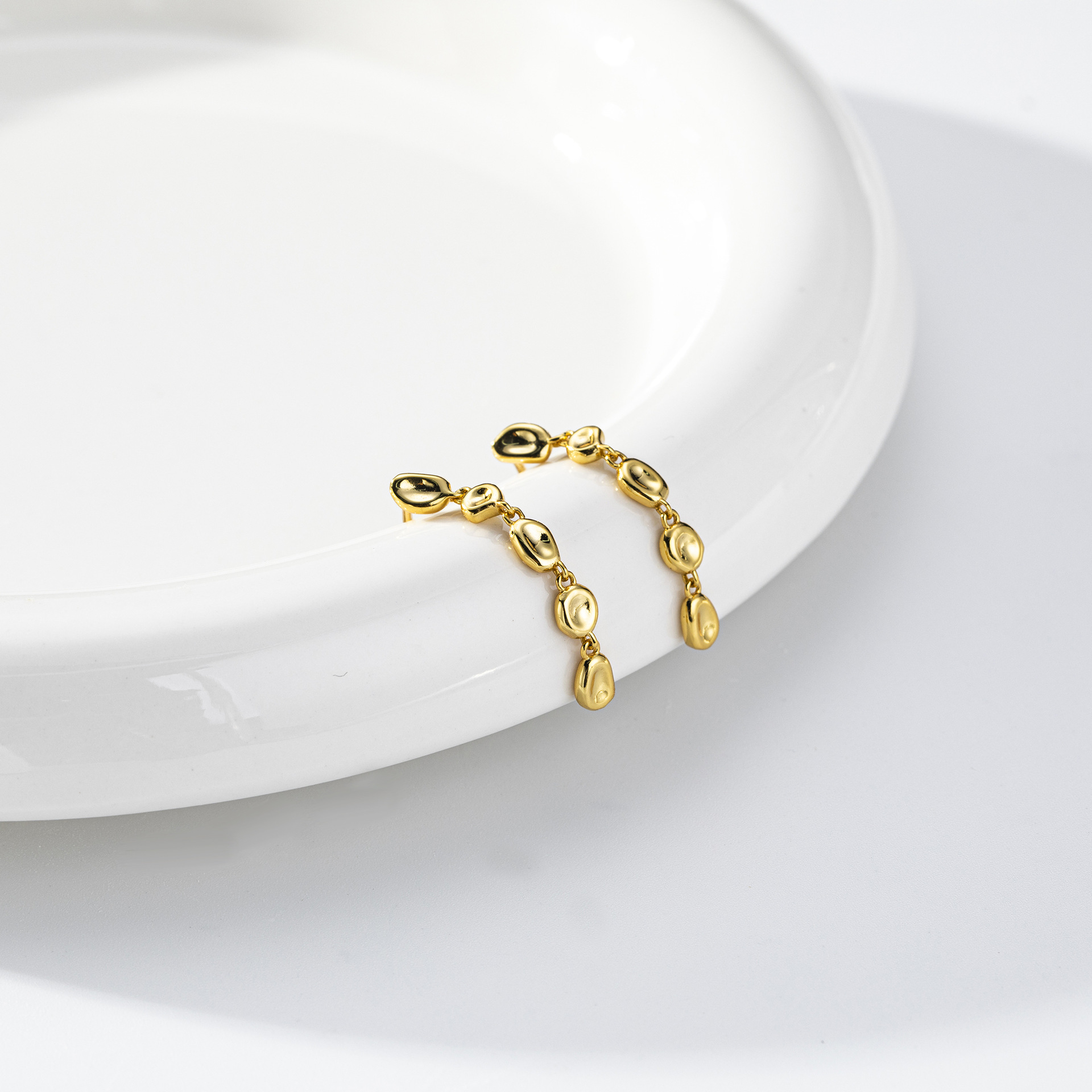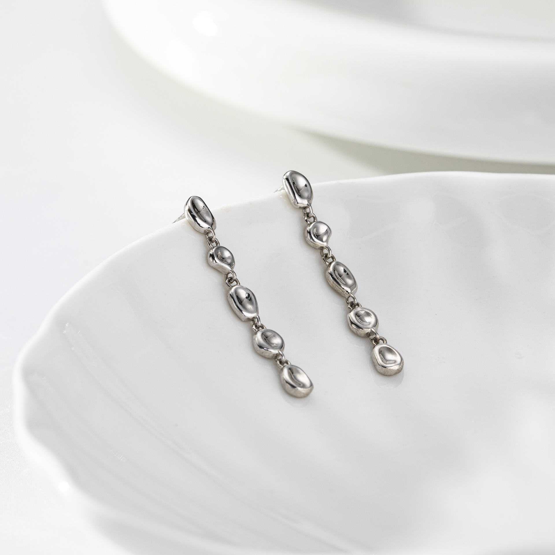 Stock the latest in texture-focused jewelry with our Wholesale 925 Sterling Silver Liquid Metal Nugget Drop Earrings. This SKU capitalizes on the "Organic/Melted" aesthetic that is currently trending on social media. The earrings feature a vertical row of asymmetrical polished beads, creating a fluid, light-catching movement similar to a metallic fringe. Available in silver and gold plating, this design offers a sophisticated, artsy alternative to standard linear drops, perfect for the modern minimalist market.