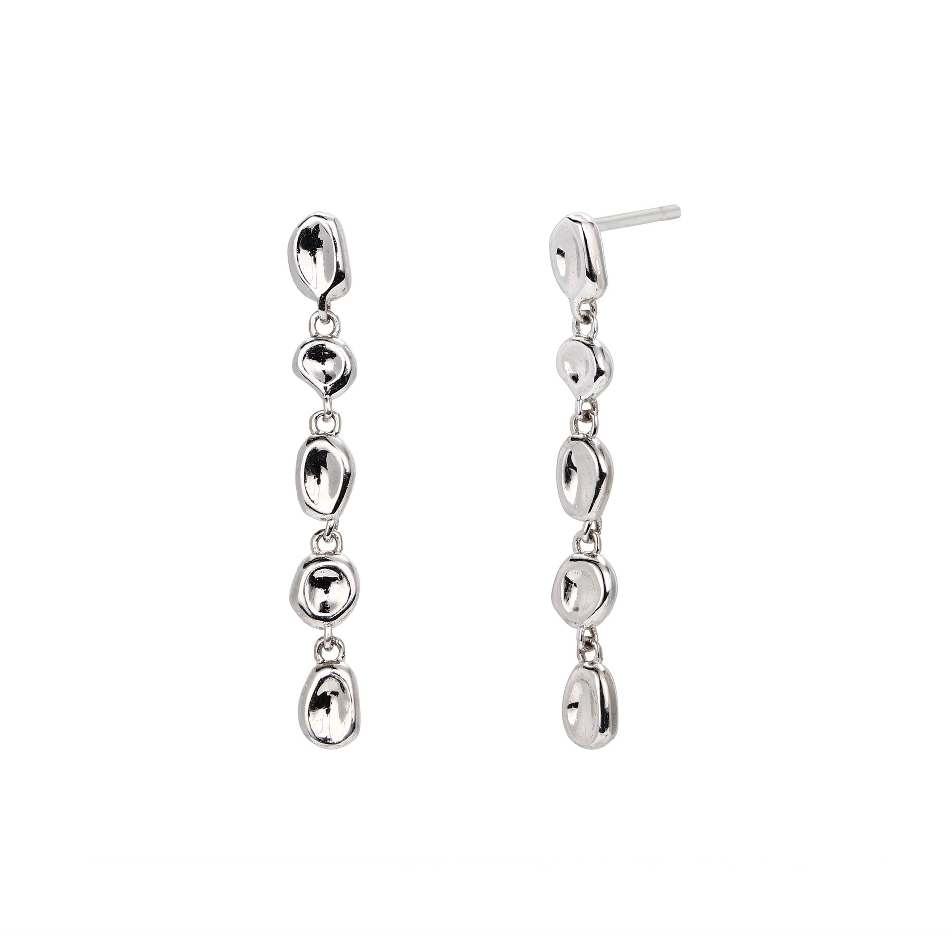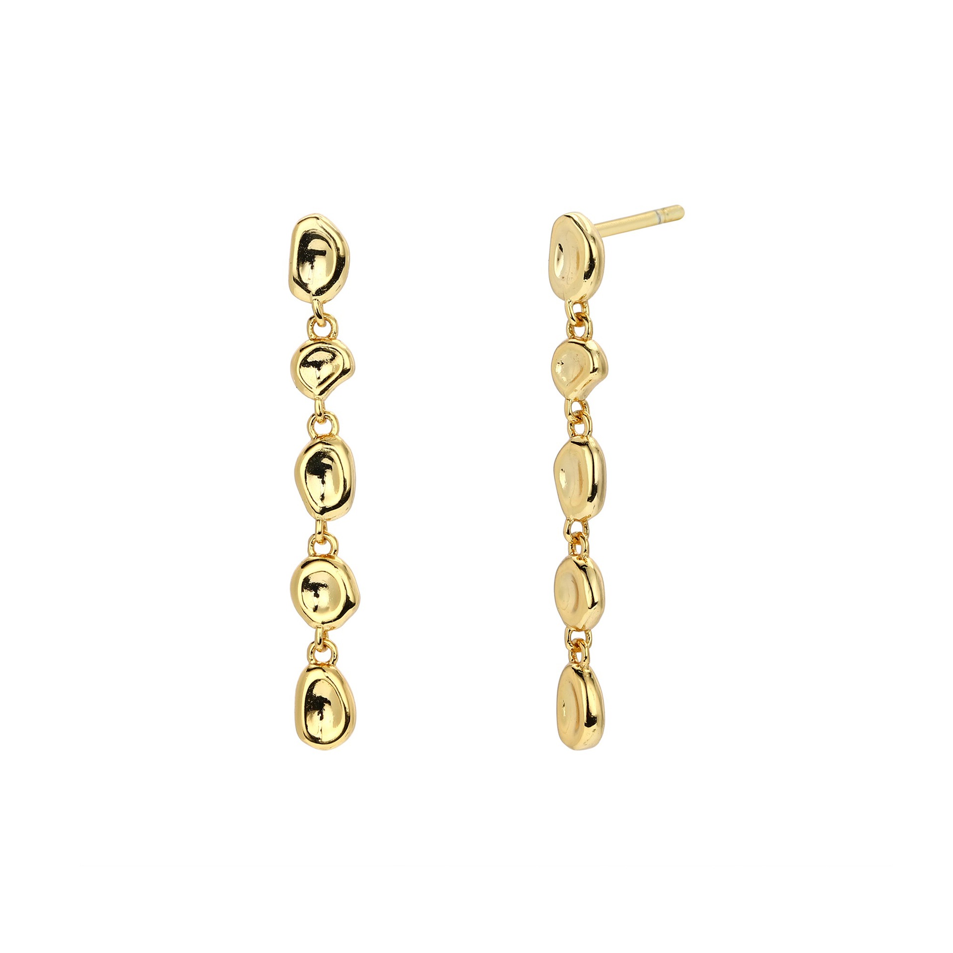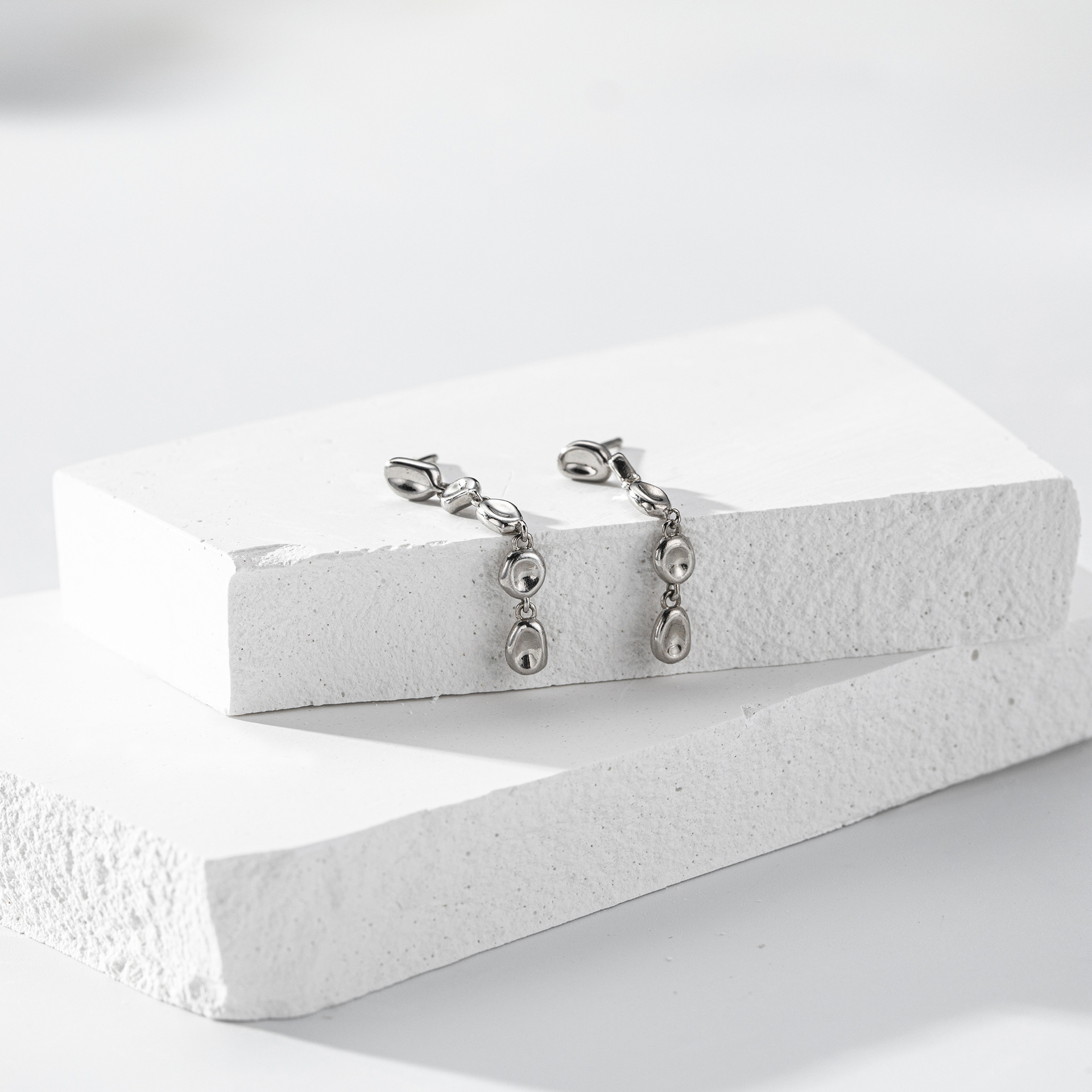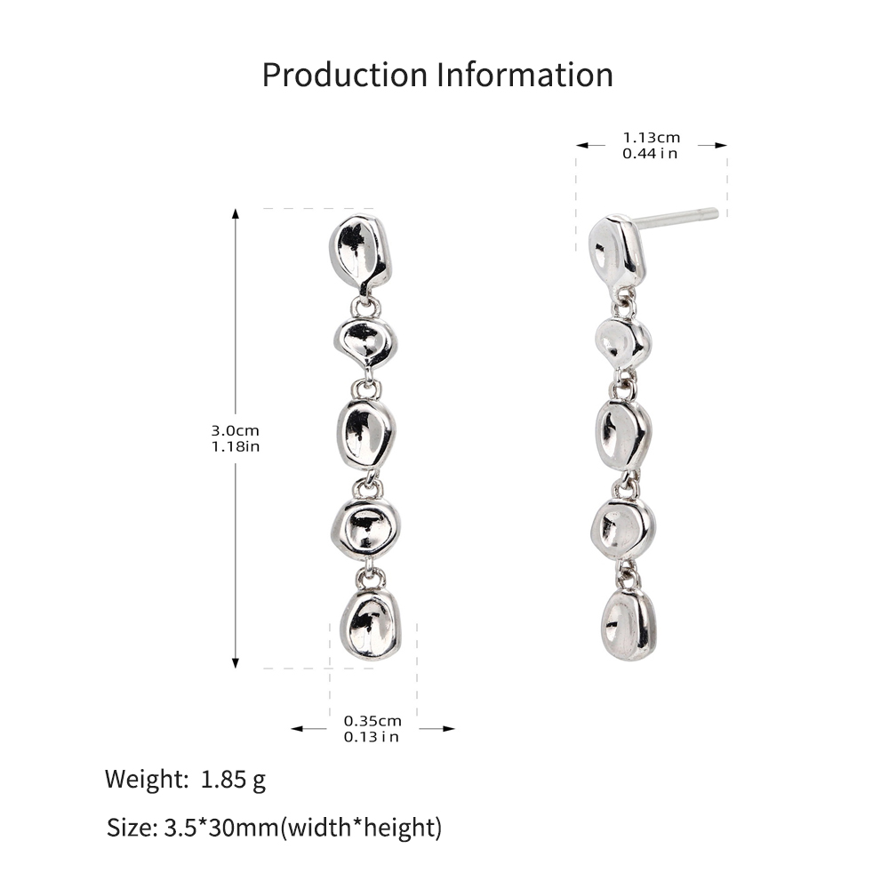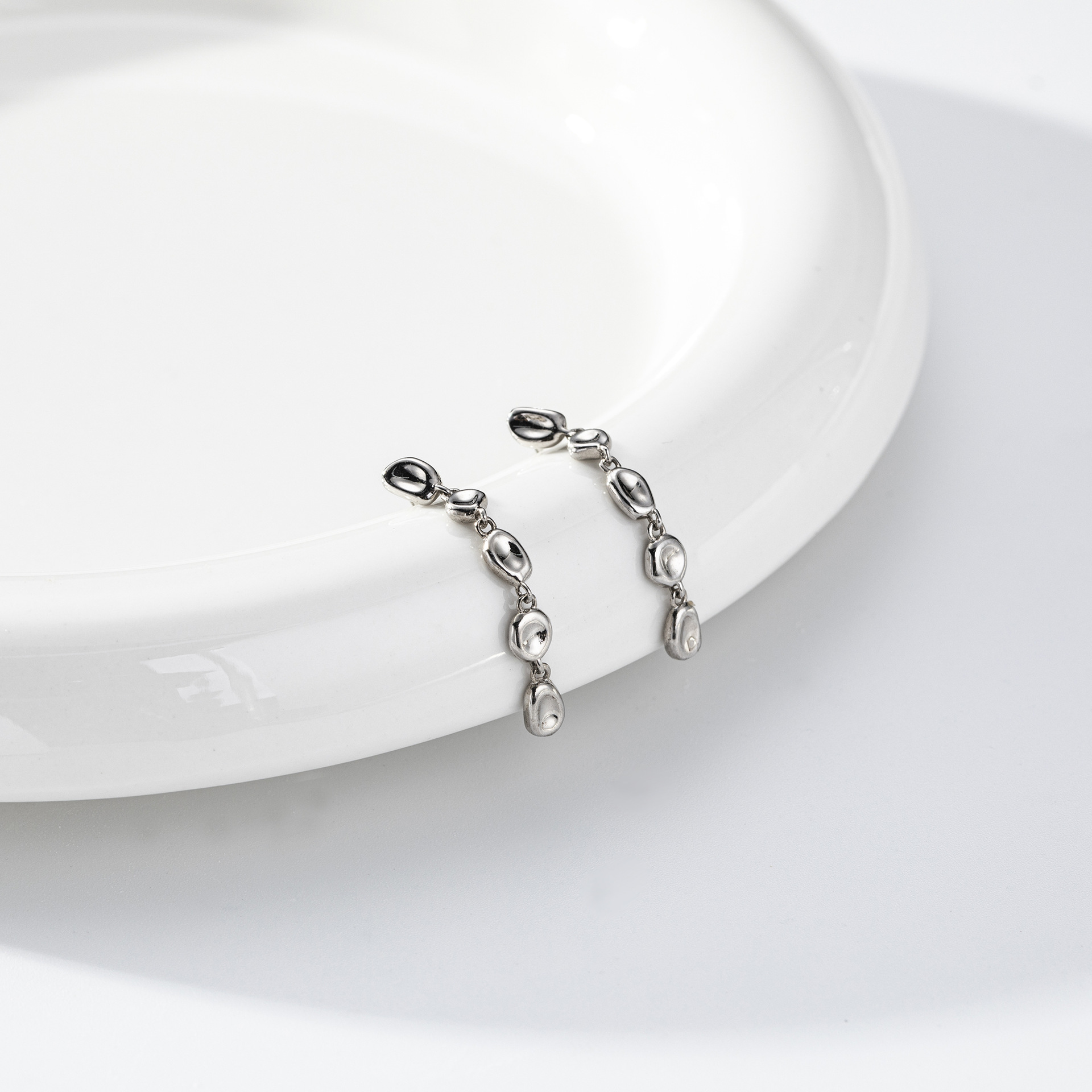 Stock the latest in texture-focused jewelry with our Wholesale 925 Sterling Silver Liquid Metal Nugget Drop Earrings. This SKU capitalizes on the "Organic/Melted" aesthetic that is currently trending on social media. The earrings feature a vertical row of asymmetrical polished beads, creating a fluid, light-catching movement similar to a metallic fringe. Available in silver and gold plating, this design offers a sophisticated, artsy alternative to standard linear drops, perfect for the modern minimalist market.