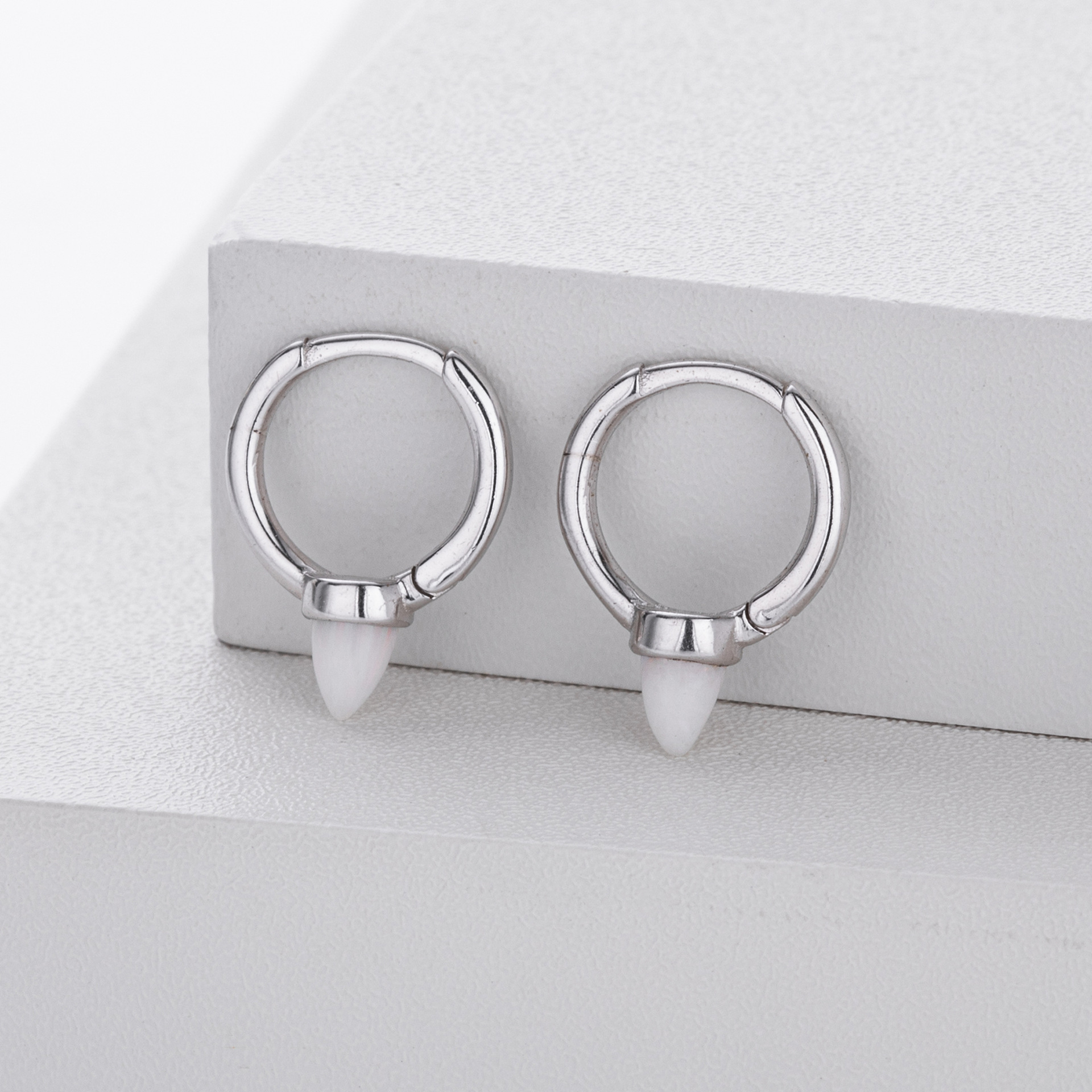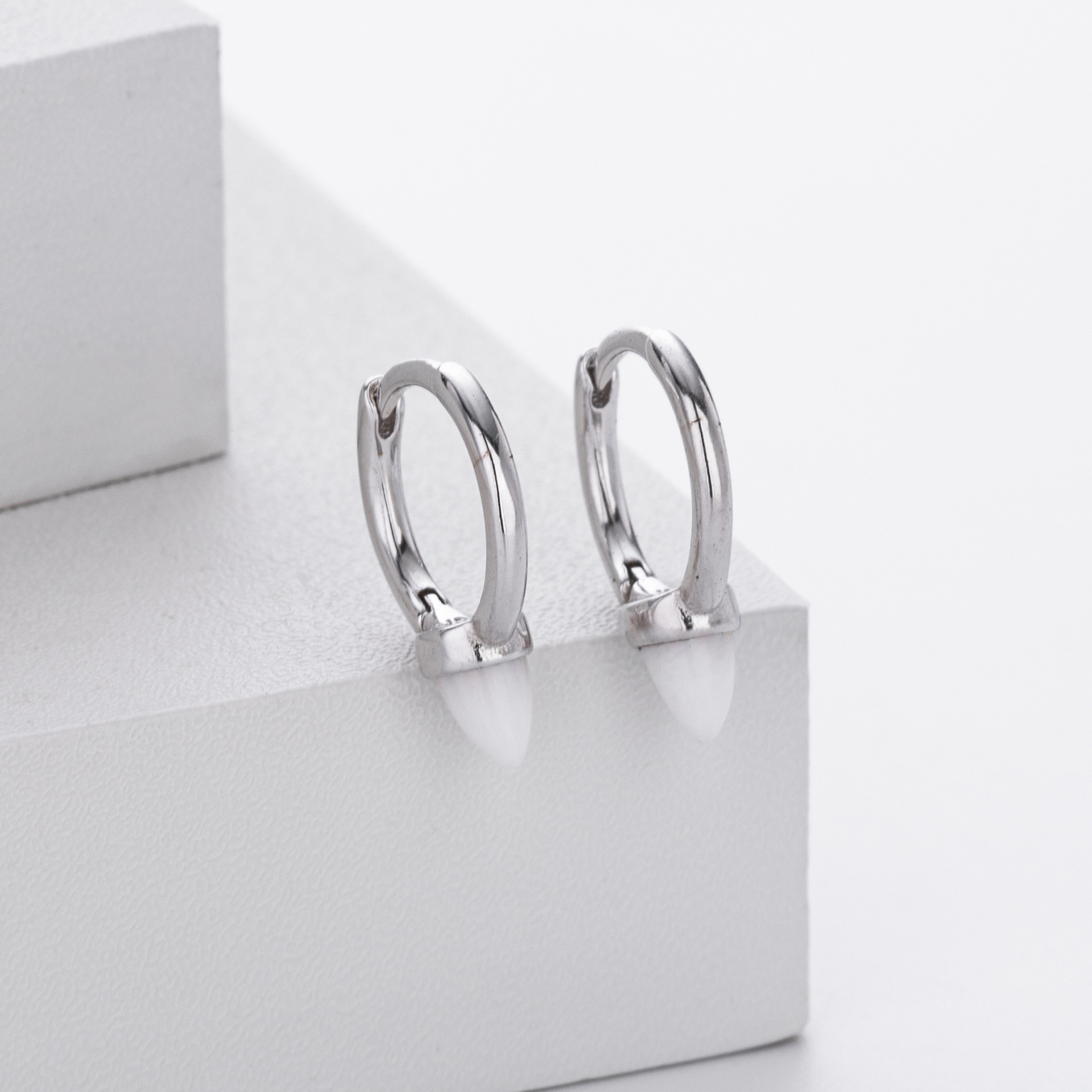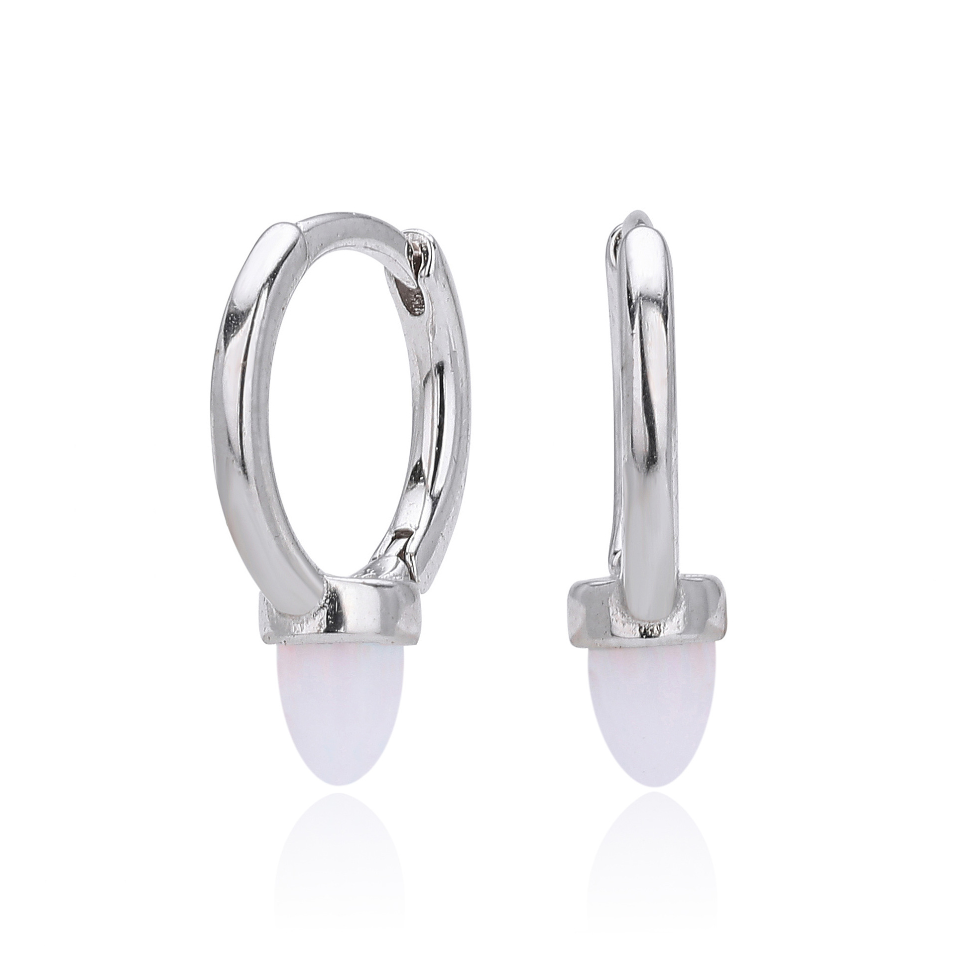 Introduce a touch of magic to your inventory with our Wholesale 925 Sterling Silver Luminous Bullet Stone Hoops. This SKU combines the edgy "Spike" or "Bullet" silhouette with the soft allure of a luminous stone, appealing to the "Sweet Cool" and minimalist trends. The petite size makes them ideal for second or third lobe piercings, catering to the "Ear Curated" market. Manufactured from solid S925 sterling silver, these earrings are a unique yet versatile addition to any modern jewelry collection.