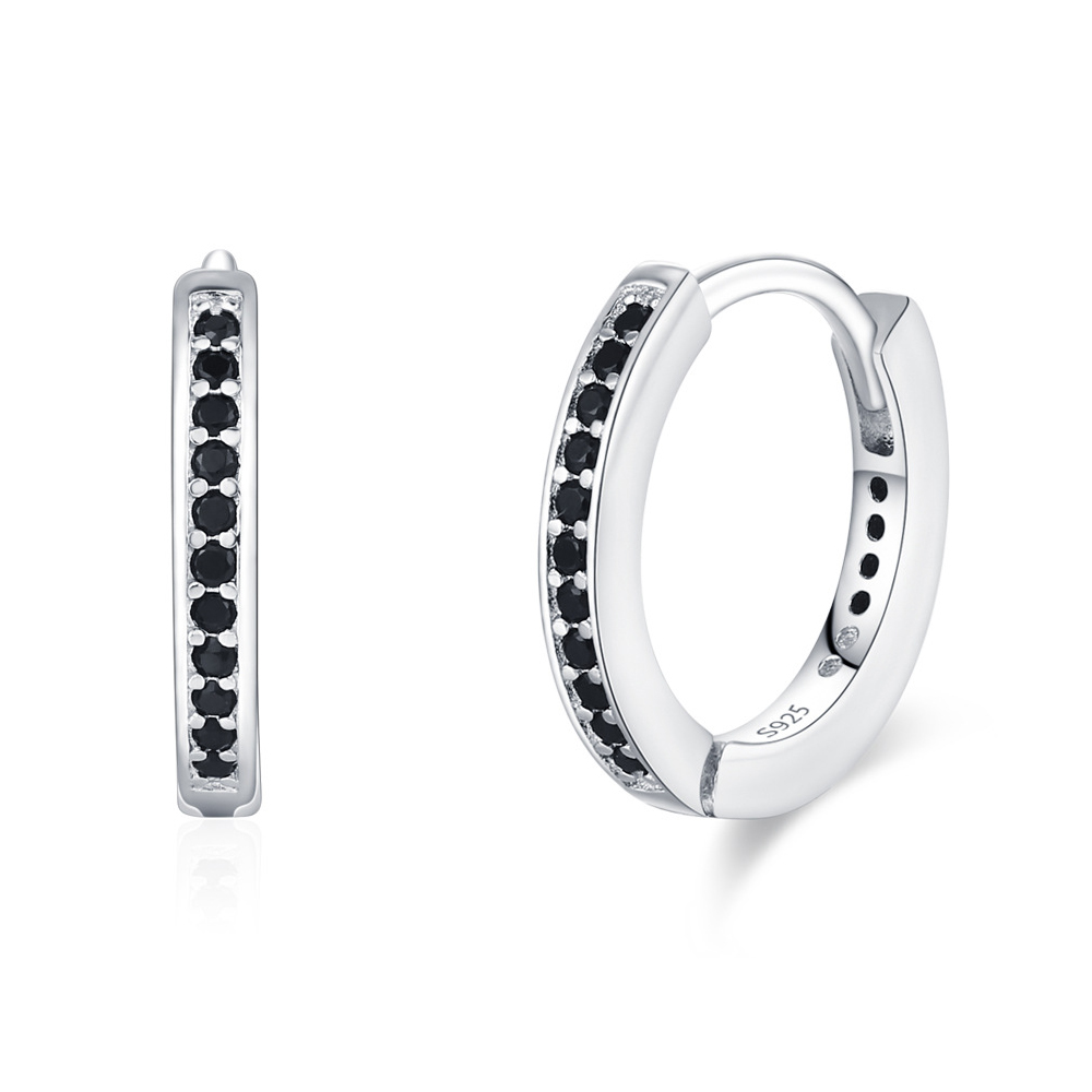 These 925 sterling silver black CZ hoop earrings offer a refined geometric look that is both trendy and timeless. Designed with precision micro-pavé black cubic zirconia, they are a versatile piece ideal for both men's and women's jewelry collections. Perfect for boutique retailers and online stores seeking minimalist luxury with urban appeal. Available in rhodium-plated finish to ensure long-lasting brilliance and anti-tarnish protection.