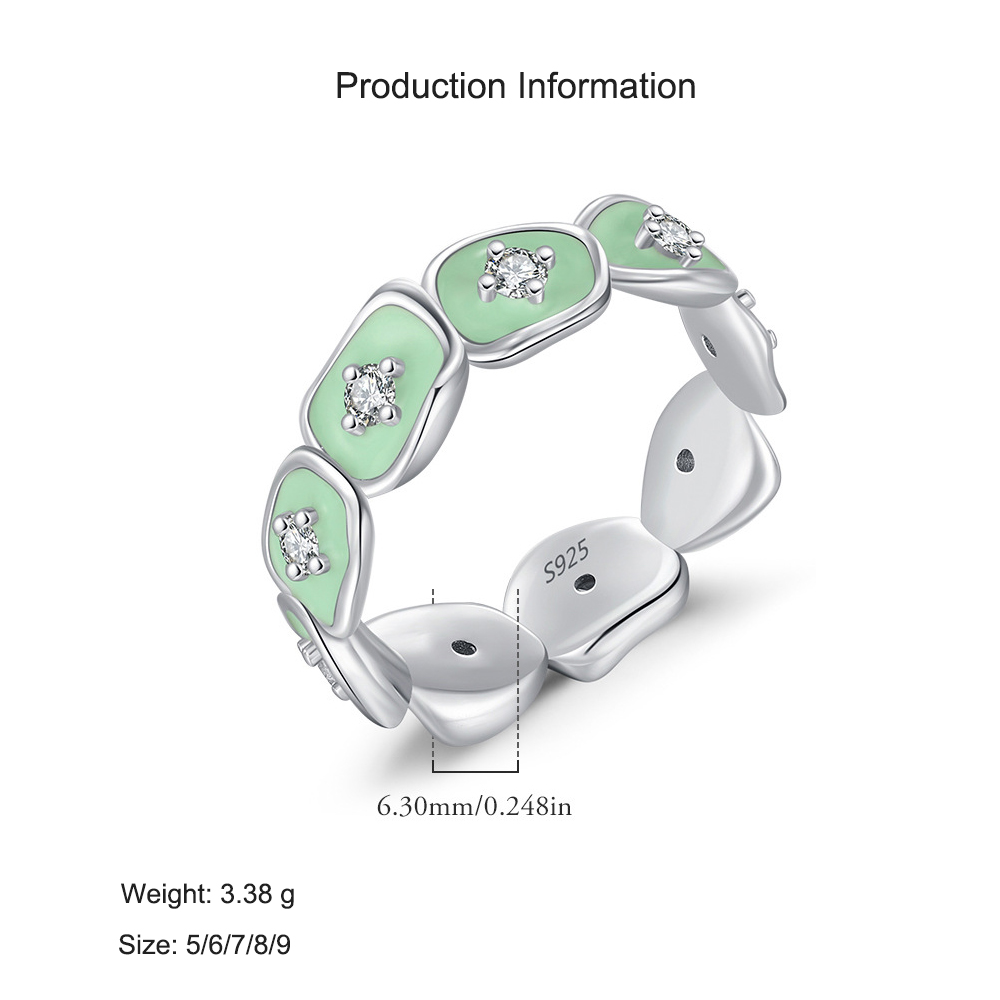 Trendy and artistic, this 925 sterling silver ring features an irregular metal-inspired band with glossy mint green enamel inlay and sparkling CZ accents. The creative design combines modern fashion with a touch of playful elegance, making it perfect for women who love unique statement jewelry. Lightweight yet eye-catching, this enamel ring is ideal for daily wear, stacking, or as a stylish gift. A must-have addition to small-batch designer collections and wholesale fashion assortments.