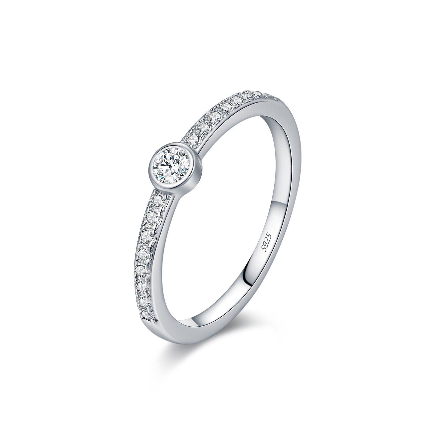 Stock the ultimate "Everyday Essential" with our Wholesale 925 Sterling Silver Moissanite Bezel Pave Ring. The "Bubble" or bezel setting is a top choice for daily wear because it protects the stone and prevents snagging on clothing, appealing to practical yet stylish consumers. This SKU elevates the simple solitaire by adding a row of pavé accents along the shank, increasing the perceived value while maintaining a minimalist aesthetic. It is a versatile performer, perfect for "Stackable Rings," "Promise Rings," or "Gifts under $50" categories.