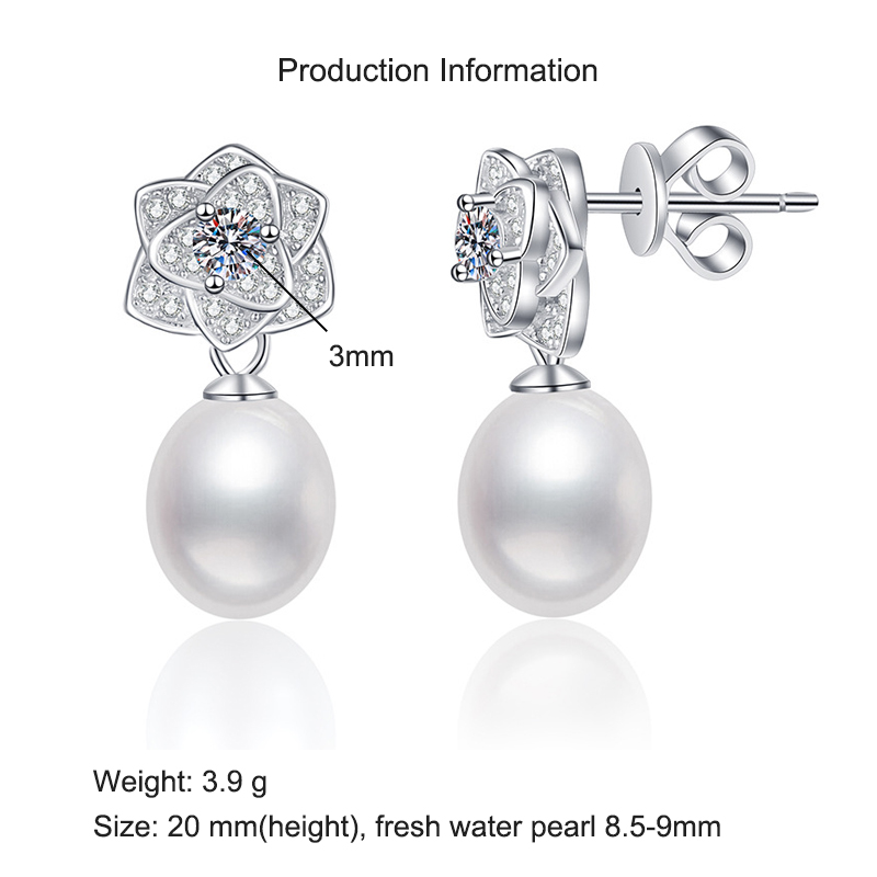 Dimension: 20mm(height), fresh water pearl 8.5-9mm, moissanite 0.2ct/3mm