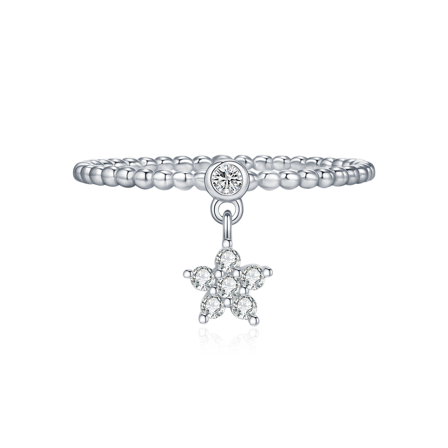This 925 sterling silver ring showcases a unique beaded band design, highlighted with a delicate dangling star pendant set with sparkling moissanite. The lightweight and refined craftsmanship exudes a chic, minimalist charm while the shimmering star adds a touch of playful elegance. Perfect for women who love small yet eye-catching details, this ring is ideal for daily wear, parties, or as a thoughtful gift. A stylish piece that combines dainty fashion with timeless luxury.