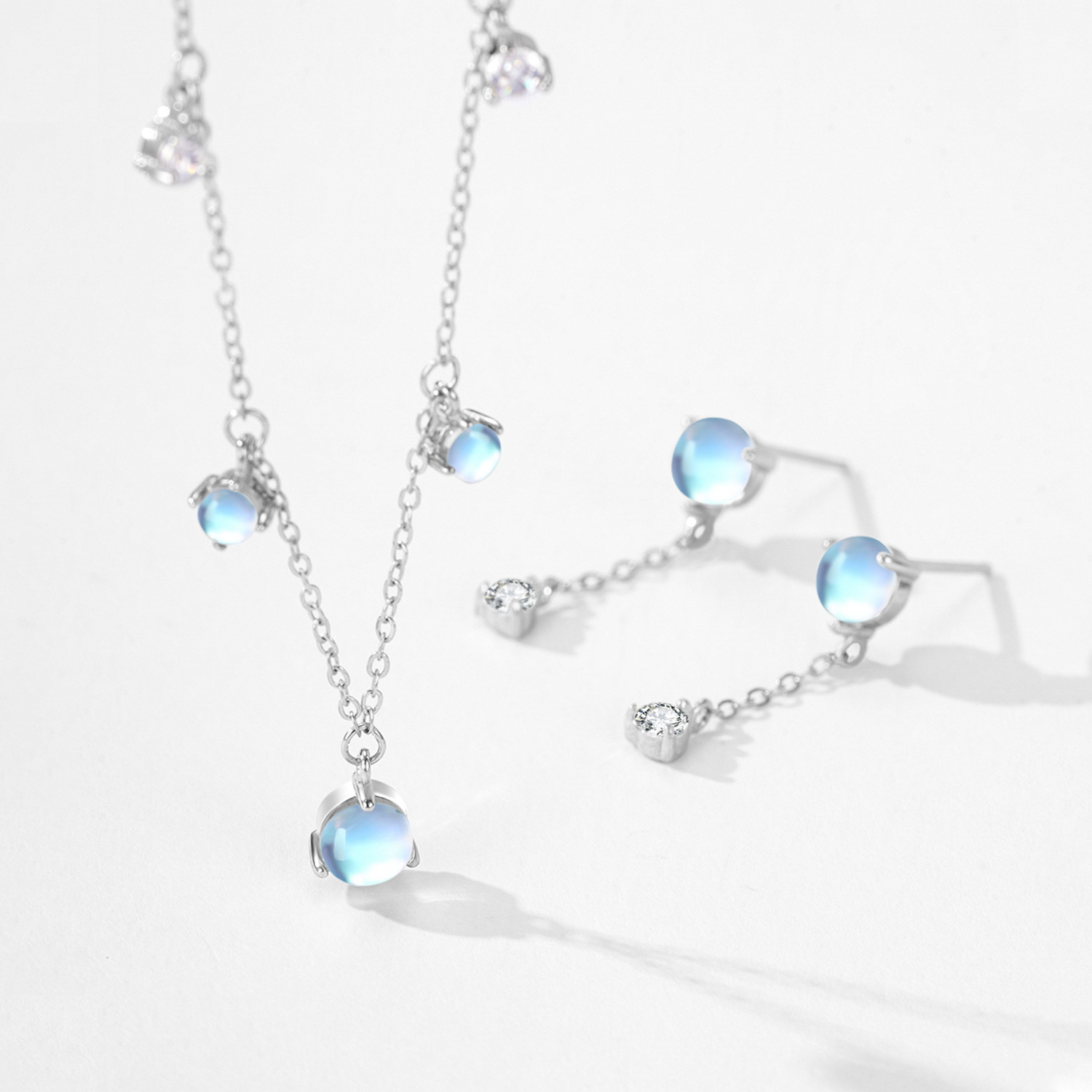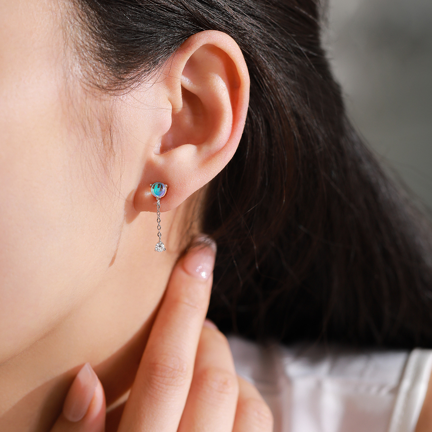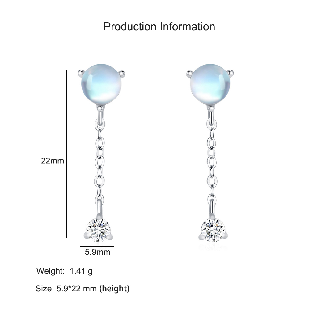 Graceful and luminous, these 925 sterling silver moonstone earrings feature a delicate chain drop design that sways with every movement. The iridescent moonstone glows softly, complemented by a brilliant cubic zirconia accent at the tip. Lightweight yet eye-catching, they embody modern elegance with a romantic touch — perfect for evening wear, special occasions, or as a thoughtful gift for someone special.