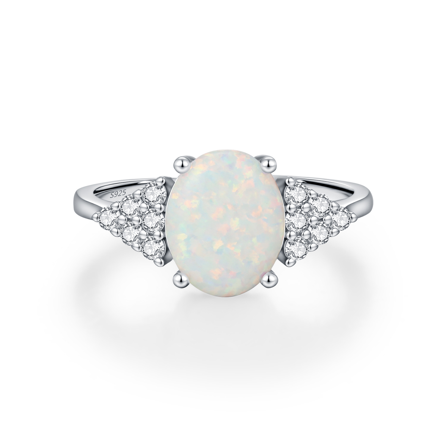 Stock the timeless appeal of our Wholesale 925 Sterling Silver Oval Created Opal Ring. The "Oval Cut" is a classic shape that elongates the finger, making it a perennial favorite in ring assortments. This SKU features a high-quality "Created White Opal" center, accented by pave-set cubic zirconia side clusters for added perceived value. It serves as an excellent price-point alternative to natural opal rings, perfect for "October Birthstone" promotions or "Promise Ring" categories.