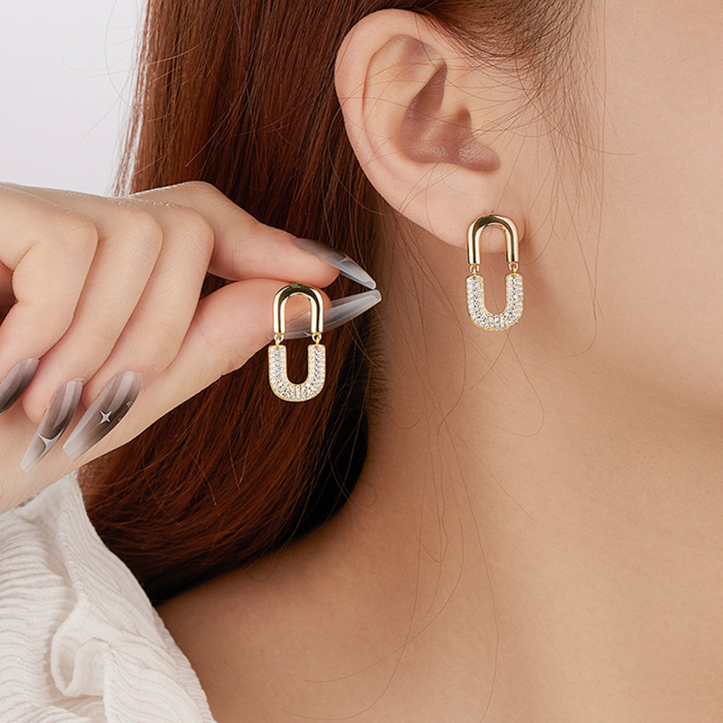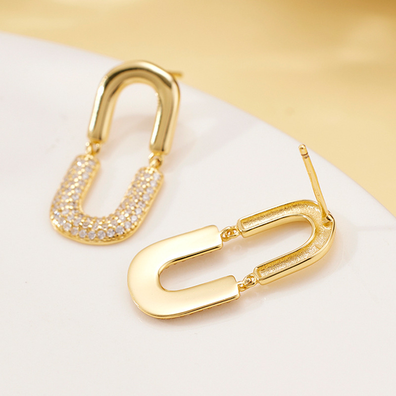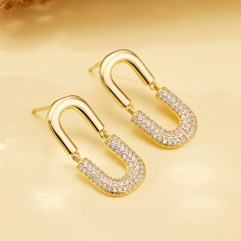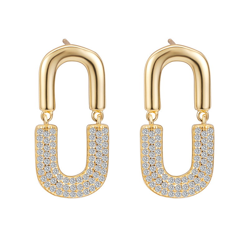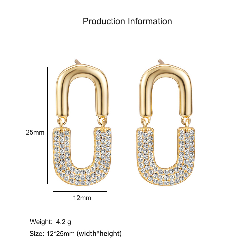 These 925 sterling silver oval drop earrings feature a bold U-shaped design, fully encrusted with sparkling zircon stones. Finished in luxurious gold plating, they radiate elegance and glamour, making them a standout accessory for evening events, parties, or special occasions.