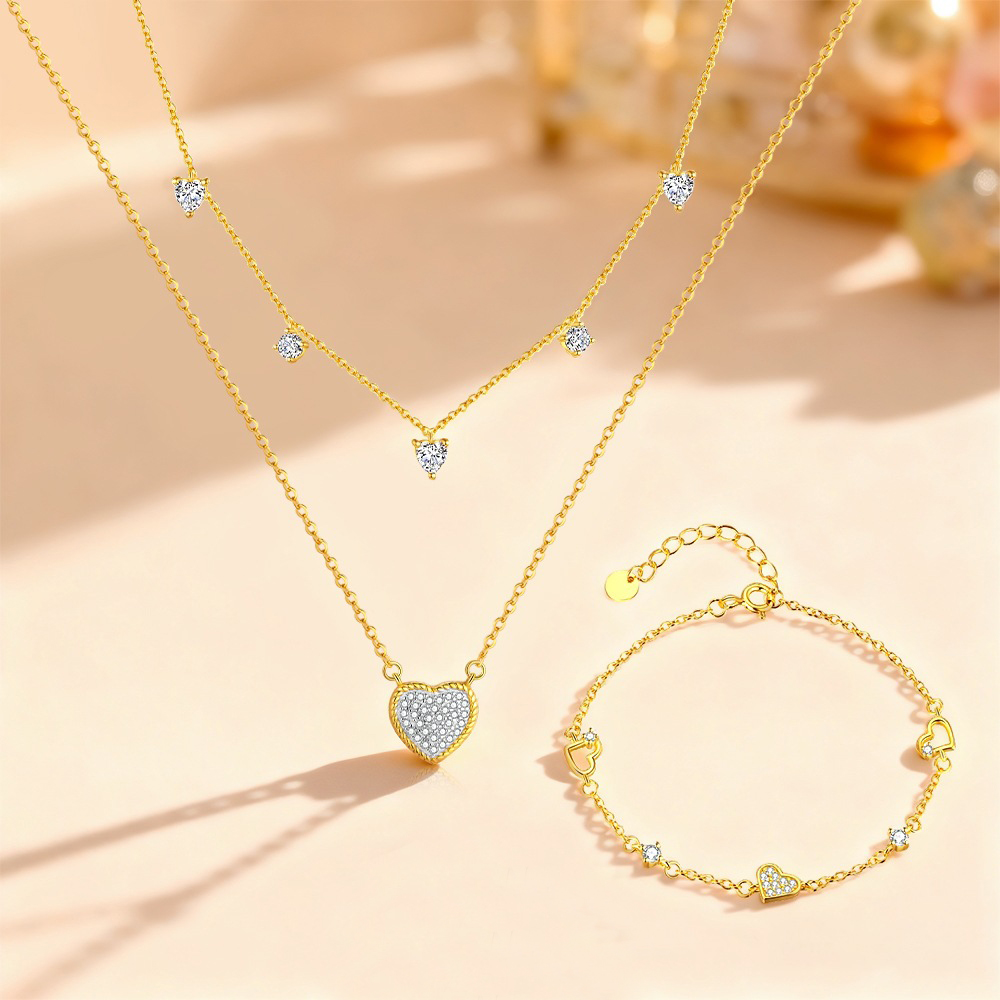 Prepare for the gifting season with our Wholesale 925 Sterling Silver Pave CZ Heart Layered Set. Heart motifs are a perennial best-seller, and this SKU elevates the design with a "Starry/Full Pave" setting that maximizes brilliance. The "Layered"necklace construction provides a trendy, substantial look, while the inclusion of a matching bracelet creates a high-value gift set perfect for Valentine's Day, anniversaries, or bridal collections. Manufactured from solid S925 sterling silver, this set ensures high customer satisfaction and strong sell-through.