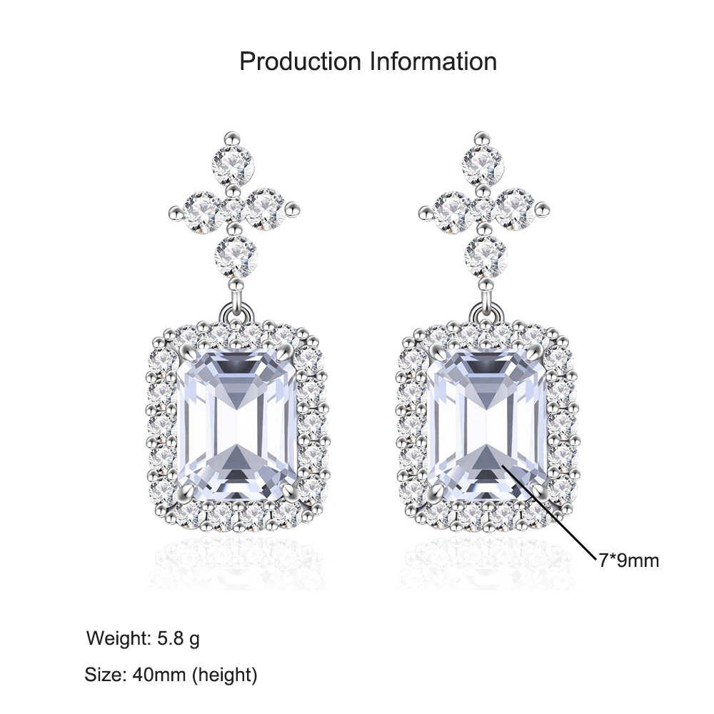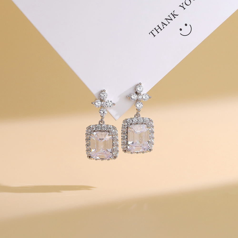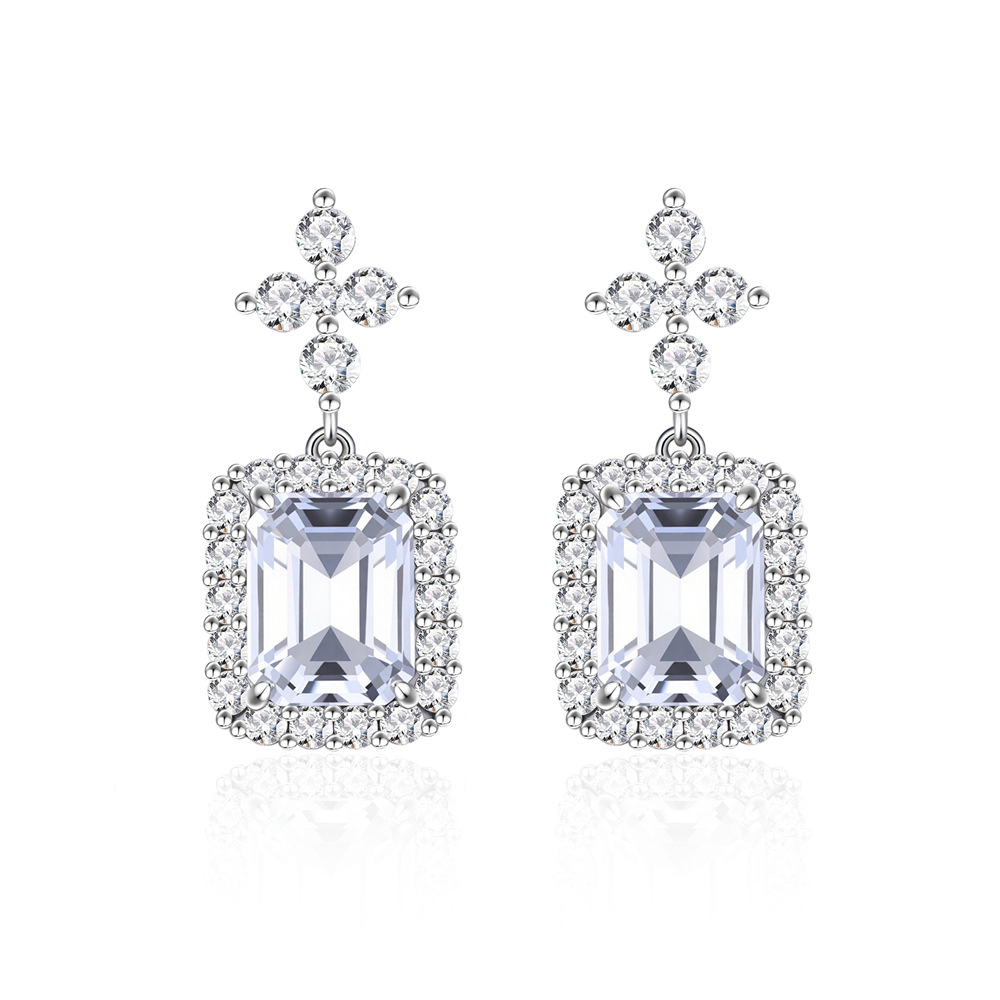 These wholesale 925 sterling silver earrings showcase a perfume bottle silhouette, designed with a large emerald-cut zircon framed by a halo of micro stones. The sophisticated cross cluster detail adds extra brilliance, making them an ideal choice for boutique jewelry collections. A trending luxury design that appeals to customers seeking elegance and statement fashion jewelry.