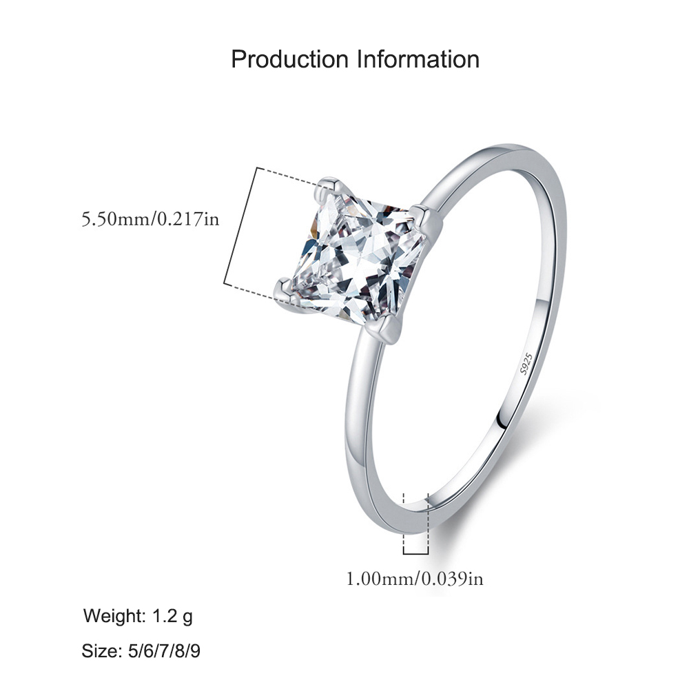 A timeless symbol of elegance, this 925 sterling silver engagement ring features a brilliant princess-cut cubic zirconia solitaire held securely in a classic four-prong setting. The minimalist design highlights the stone's sparkle, making it a perfect choice for modern brides who appreciate both sophistication and simplicity. Ideal as a proposal ring, promise ring, or anniversary gift, this piece captures everlasting love in a refined and stylish way.