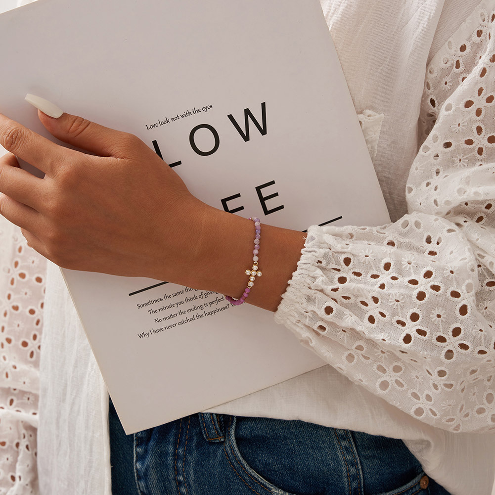 Diversify your inventory with our highly profitable Wholesale S925 Sterling Silver Gemstone & Pearl Cross Bracelet. This unique piece is a must-have for any retailer, as it combines the enduring appeal of natural gemstones with a timeless symbolic design. The beautiful, distinct colors of the lilac mica and the classic beauty of the pearl cross ensure this piece will appeal to a wide customer base, including those looking for meaningful accessories.