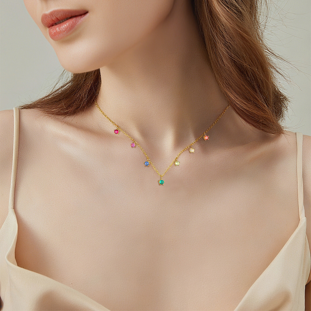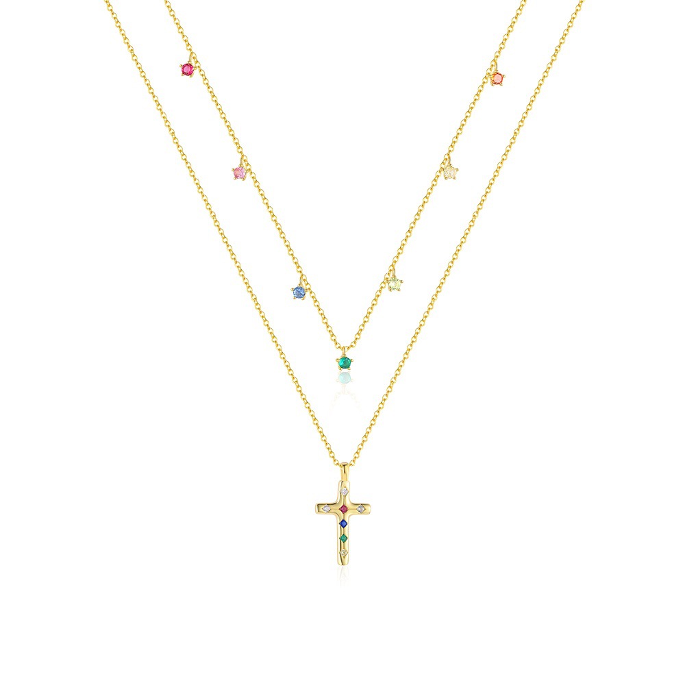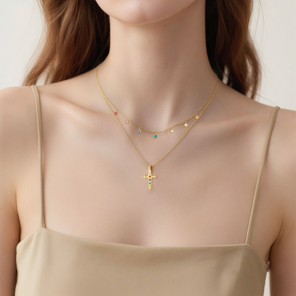 Capitalize on the "Dopamine" and "Y2K" colorful jewelry trends with our Wholesale 925 Sterling Silver Multi-Color CZ Cross Double Chain Necklace. This SKU offers high perceived value by combining two necklace styles into one: a "Station" choker with dangling colorful gems and a pendant necklace featuring a "Cross" set with matching Zircons. The "Layered/Stacked" look is incredibly popular, and this pre-styled piece removes the guesswork for the end consumer. Manufactured from solid S925 sterling silver, it is a perfect highlight item for spring/summer collections.