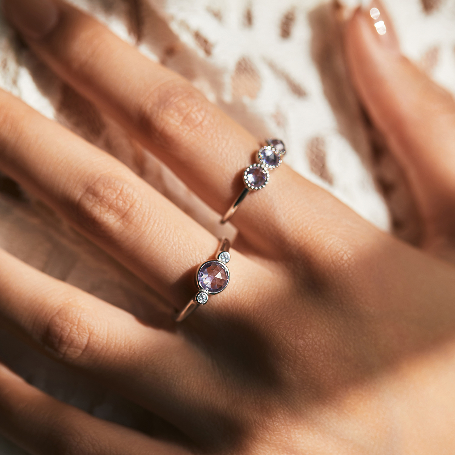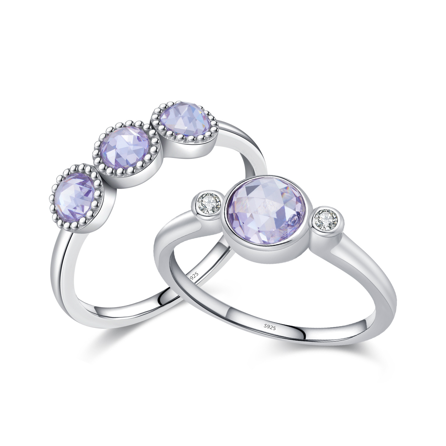Crafted from 925 sterling silver, these rings feature soft lavender-toned round-cut CZ crystals in modern bezel and beaded settings. With their gentle pastel hue and Korean-inspired design, they're ideal for daily wear, stacking, or gifting someone who loves subtle, feminine elegance.