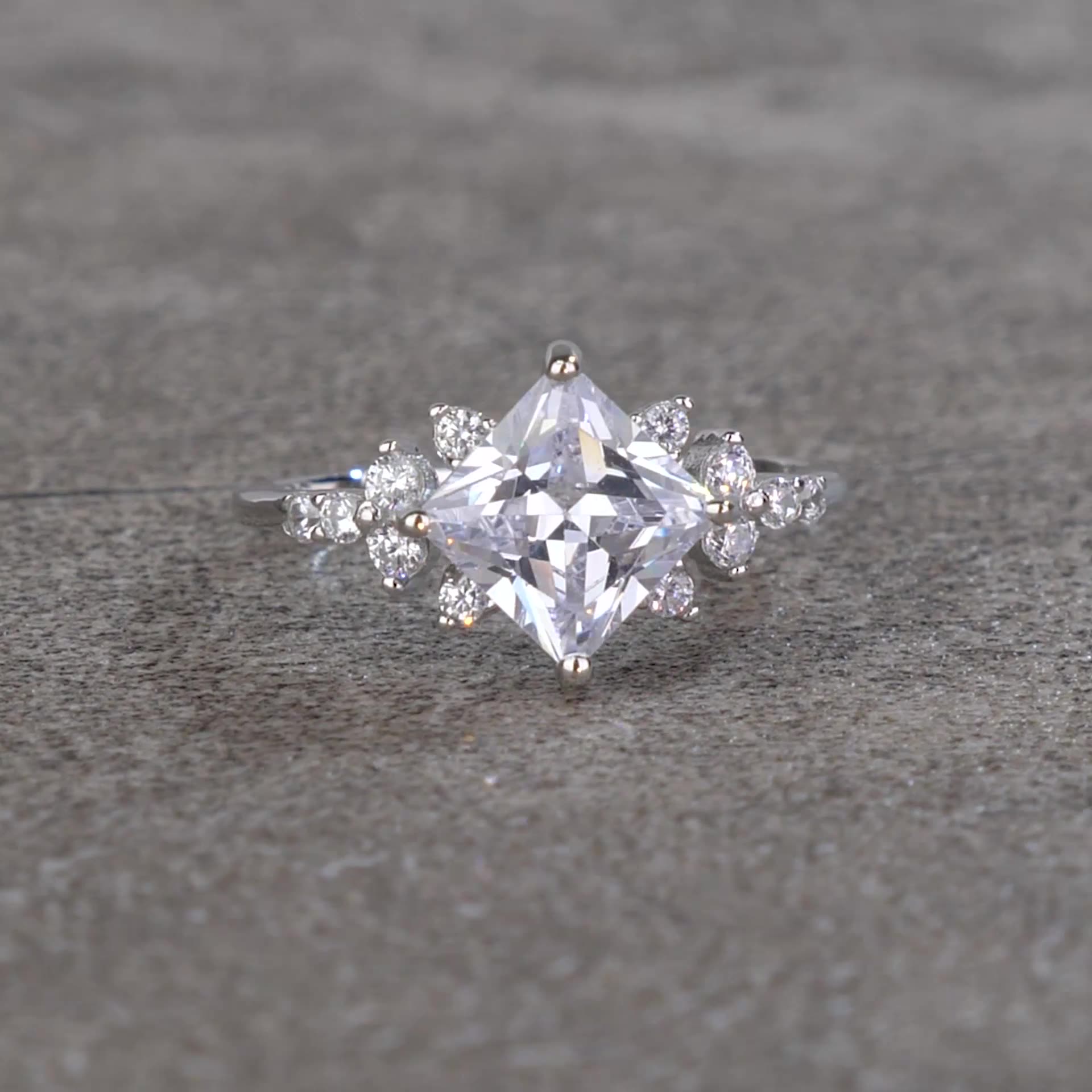 Radiant and refined, this 925 sterling silver ring features a stunning princess-cut cubic zirconia centerpiece framed by smaller round CZ accents for extra brilliance. The detailed side design adds depth and luxury, making it a captivating piece for both daily elegance and special occasions. Crafted from genuine sterling silver and finished with rhodium plating, it offers long-lasting shine and resistance to tarnish.
