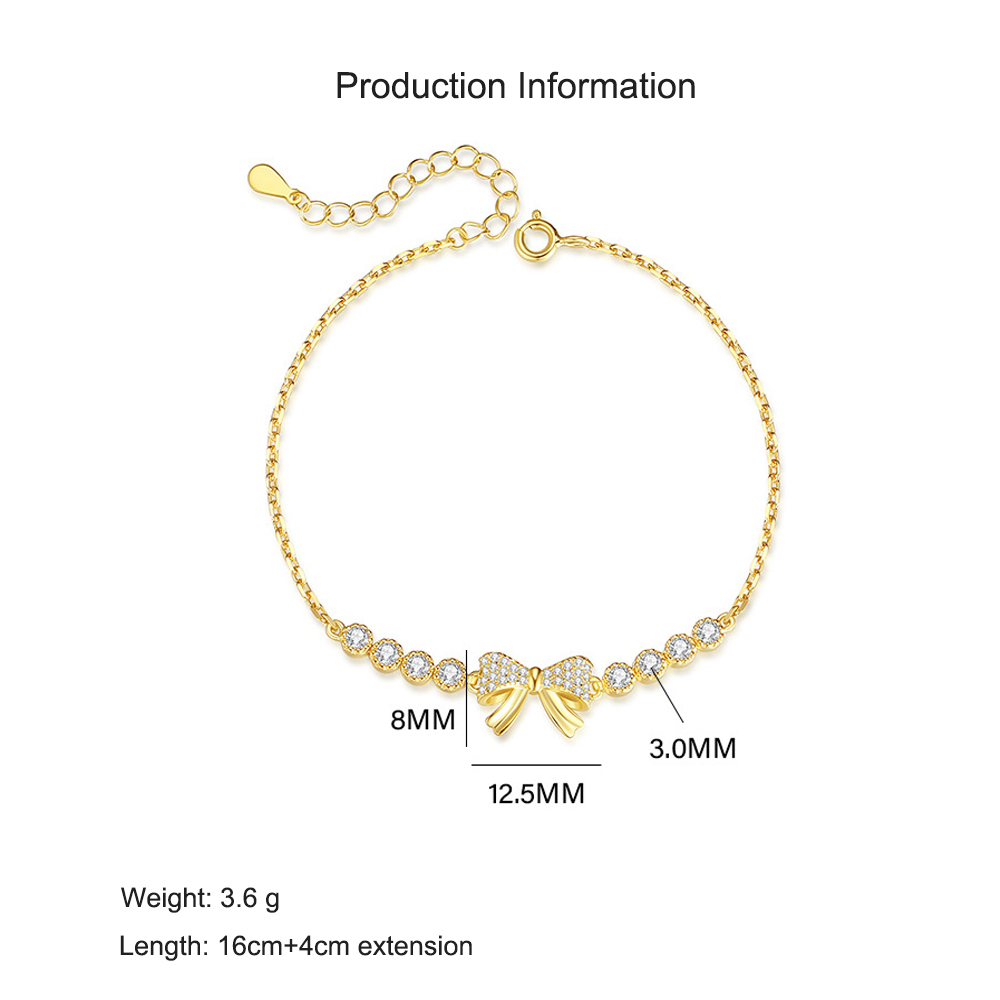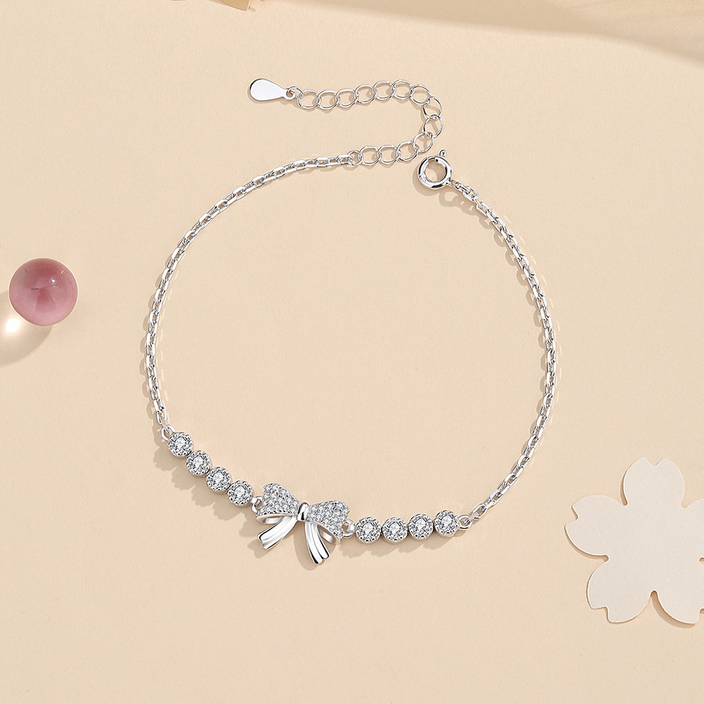 Add a touch of feminine charm with this 925 sterling silver bracelet featuring a delicate bowknot centerpiece accented with shimmering pavé-set zircon stones. The sweet ribbon design is flanked by a row of sparkling round-cut stones, creating a graceful and romantic look. Adjustable for a perfect fit, this bracelet is ideal for dates, parties, or gifting.